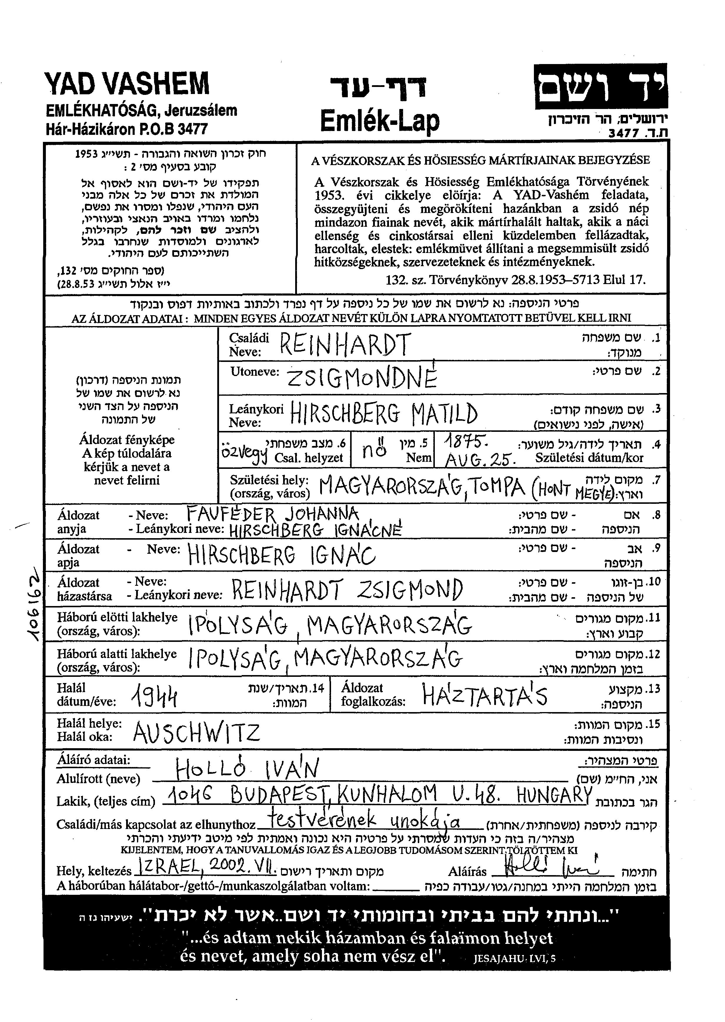 Matild Reinhardt, geb. Hirschberg wurde im Jahr 1875 in Tompa, Tschechoslowakei geboren. Sie war die Tochter von Ignac und Johanna. Sie war Hausfrau und mit Zsigmond Verwitwet. Vor dem Zweiten Weltkrieg lebte sie in Ipolysag, Tschechoslowakei. Während des Krieges war sie in Ipolysag, Tschechoslowakei.