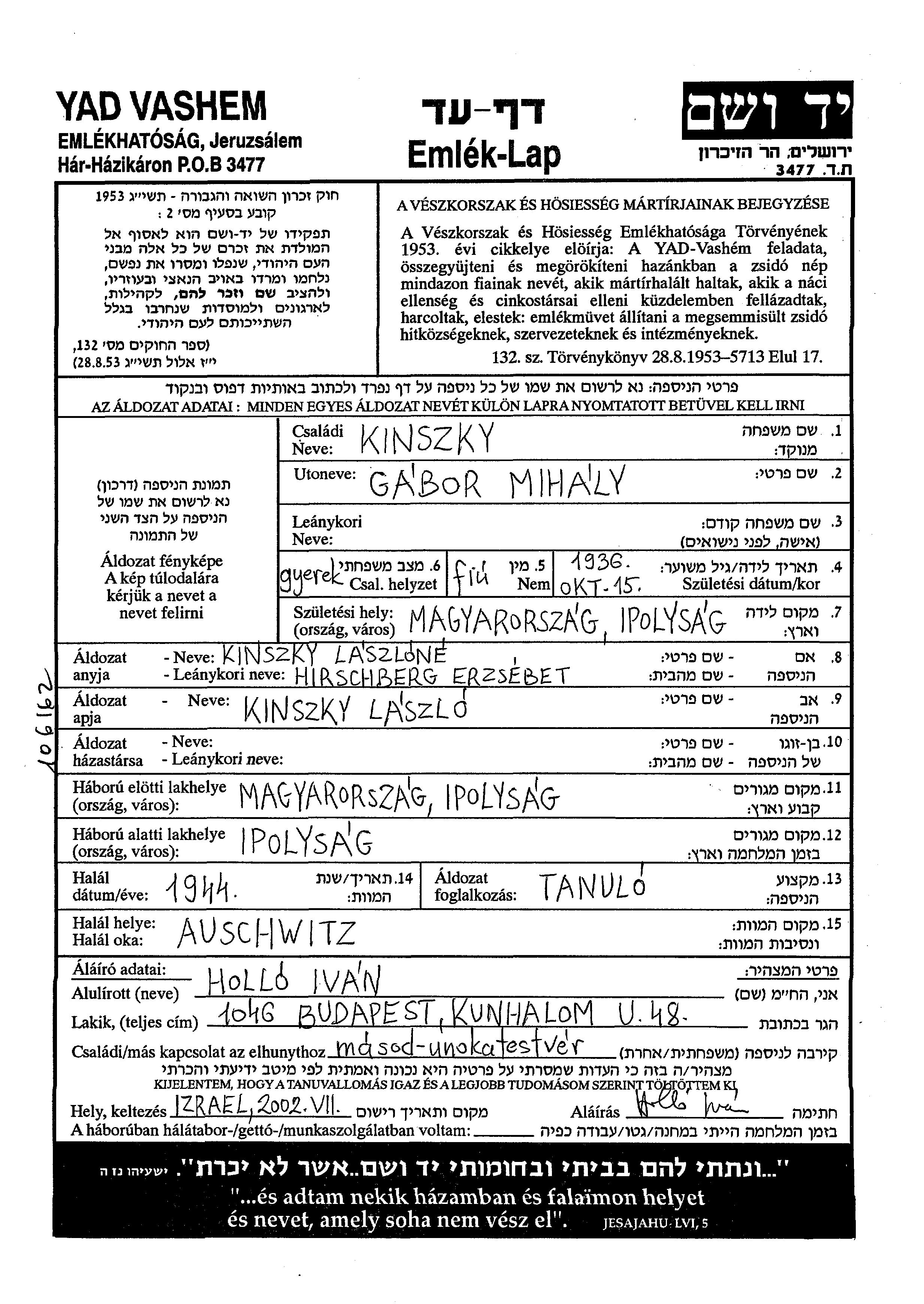 Gabor Mihaly wurde in der Schoah ermordet. Todesort: Auschwitz, Polen im Jahr 1944.