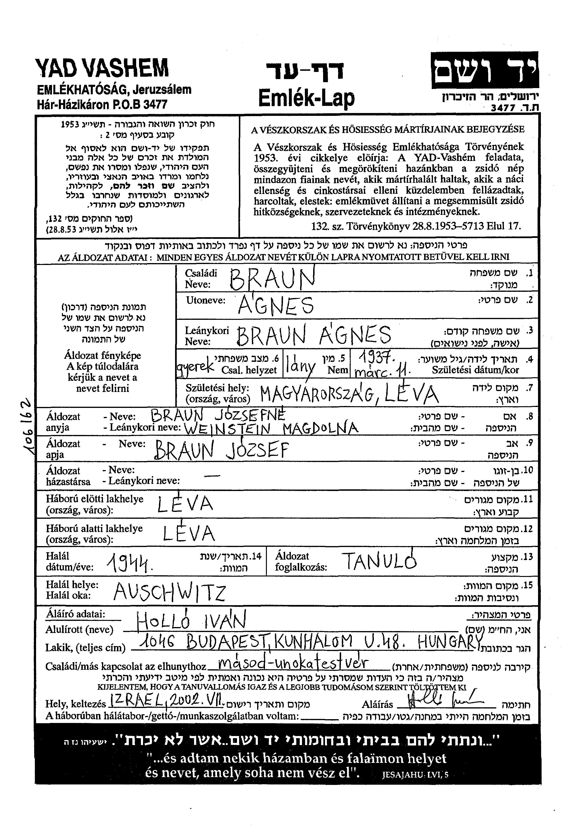 Agnes Braun wurde im Jahr 1937 in Leva, Tschechoslowakei geboren. Sie war die Tochter von Jozsef und Magdolna. Sie war Schüler/-in und Kind. Vor dem Zweiten Weltkrieg lebte sie in Leva, Tschechoslowakei. Während des Krieges war sie in Leva, Tschechoslowakei.