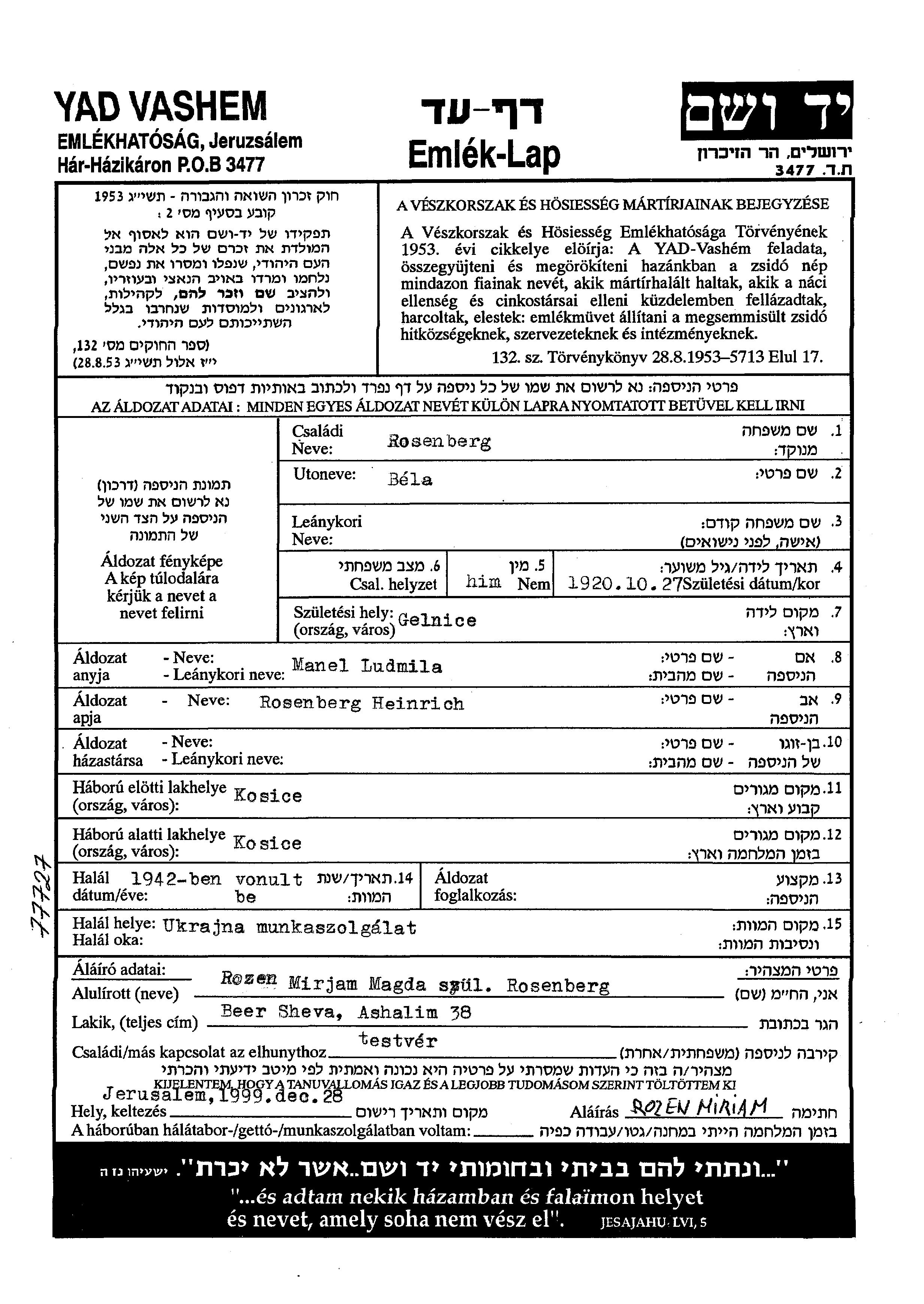 Bela Rosenberg wurde im Jahr 1920 in Gelnica, Tschechoslowakei geboren. Er war der Sohn von Heinrich und Ludmila. Vor dem Zweiten Weltkrieg lebte er in Kosice, Tschechoslowakei. Während des Krieges war er in Kosice, Tschechoslowakei.