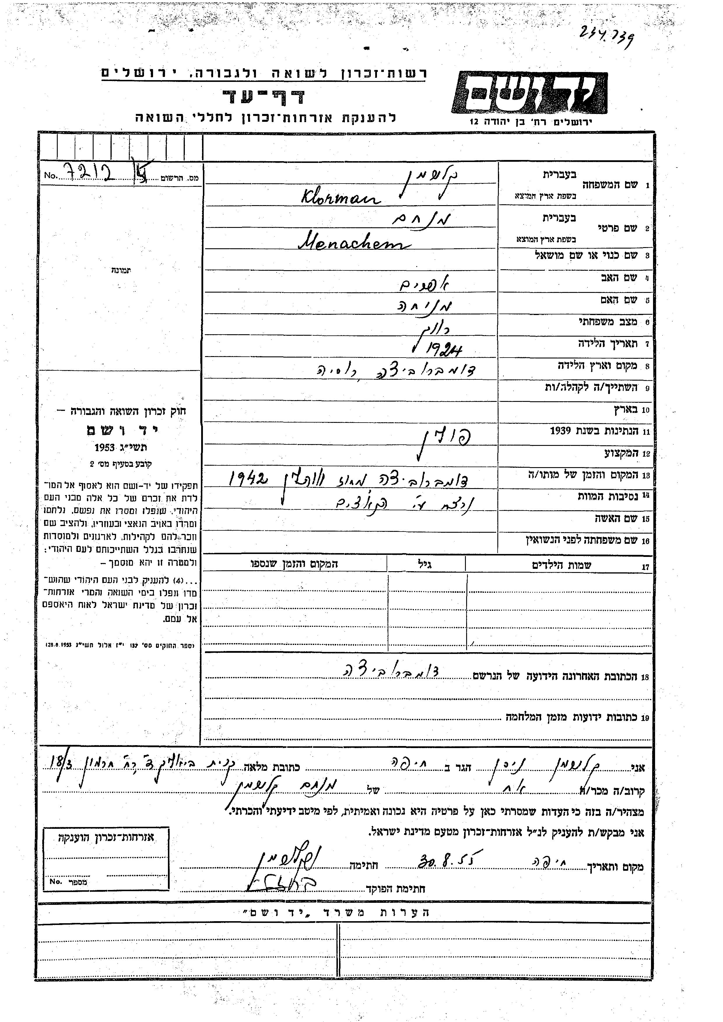 Menachem wurde in der Schoah ermordet. Todesort: Dabrowica, Polen im Jahr 1942.