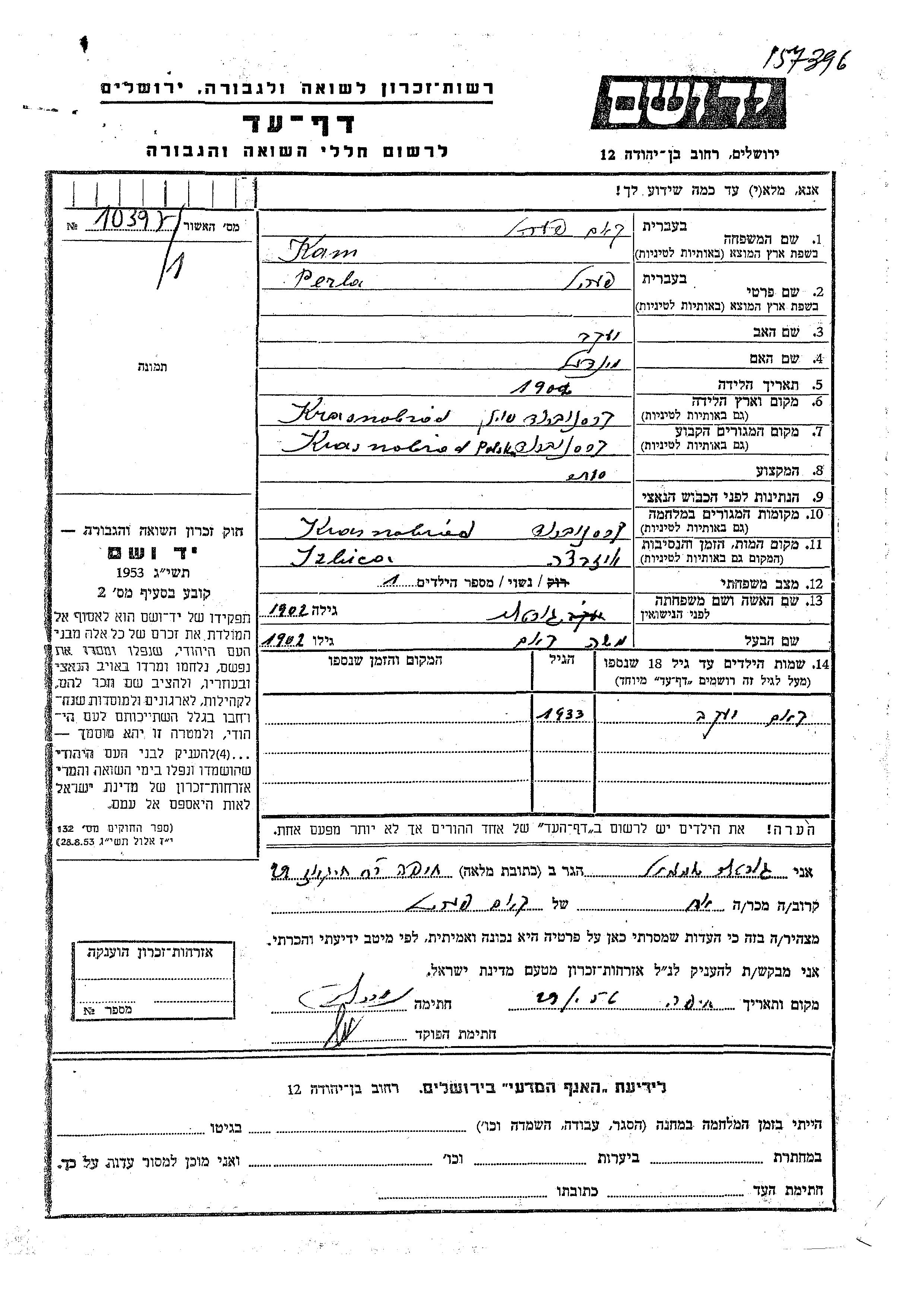 Perla Kam, geb. Gortler wurde im Jahr 1902 in Krasnobrod, Polen geboren. Sie war die Tochter von Yaakov und Mindil. Sie war Kaufmann/-frau und mit Moshe Verheiratet. Vor dem Zweiten Weltkrieg lebte sie in Krasnobrod, Polen. Während des Krieges war sie in Krasnobrod, Polen.
