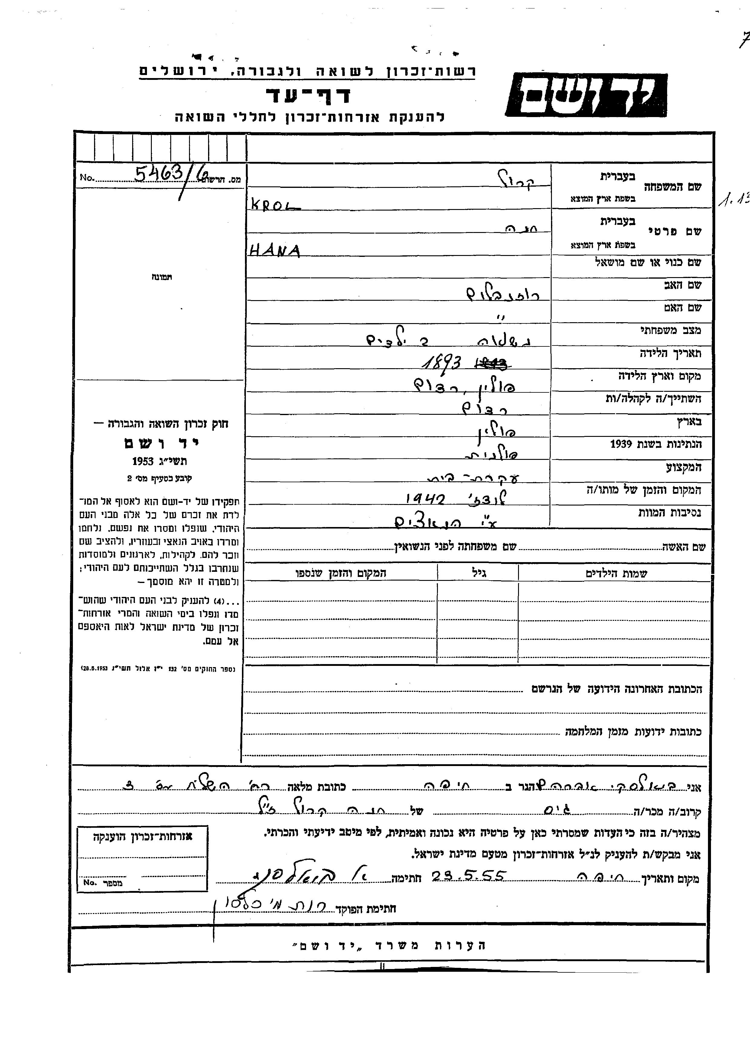 Hana Krol, geb. Rozenblum wurde im Jahr 1893 in Radom, Polen geboren. Sie war Hausfrau und Verheiratet. Vor dem Zweiten Weltkrieg lebte sie in Radom, Polen.