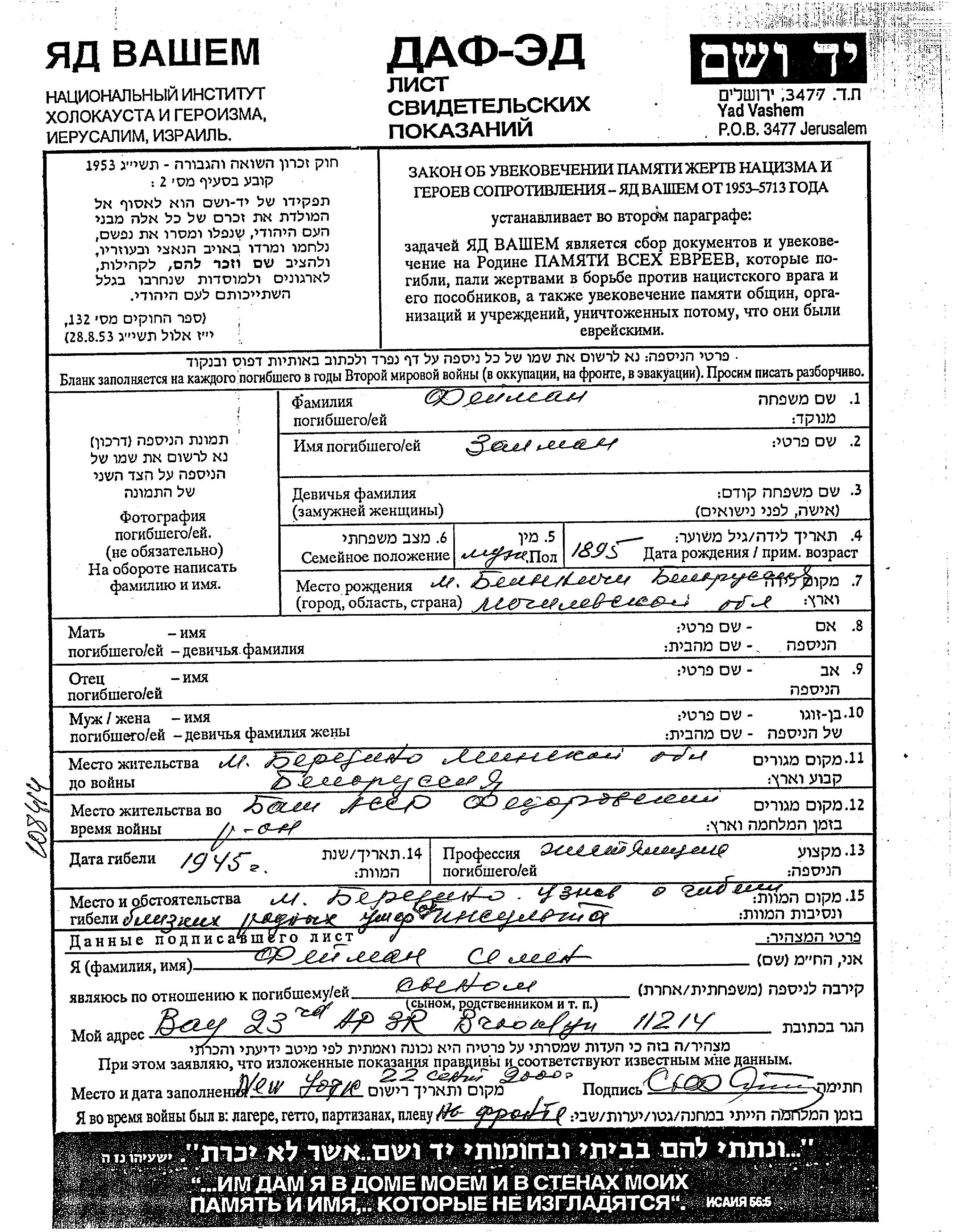 Zalman Feiman wurde im Jahr 1895 in Belynichi, Weißrussland (UdSSR) geboren. Er war Blechschmied und Verheiratet. Vor dem Zweiten Weltkrieg lebte er in Berezino, Weißrussland (UdSSR). Während des Krieges war er in Bashkiriya ASSR, Russland (UdSSR).