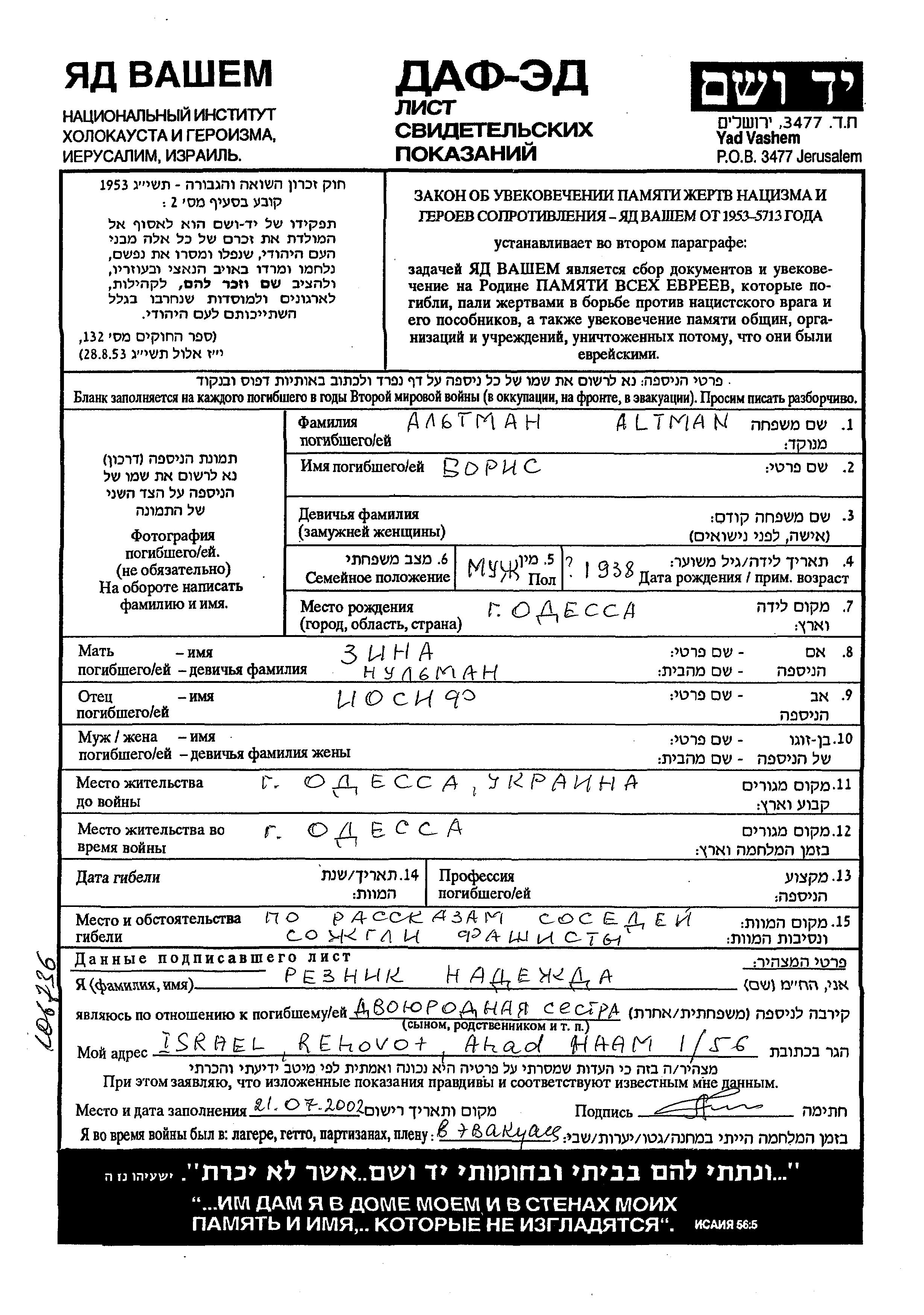 Altman Boris 1938 Odess, Ukraine (UdSSR) Gedenkblatt