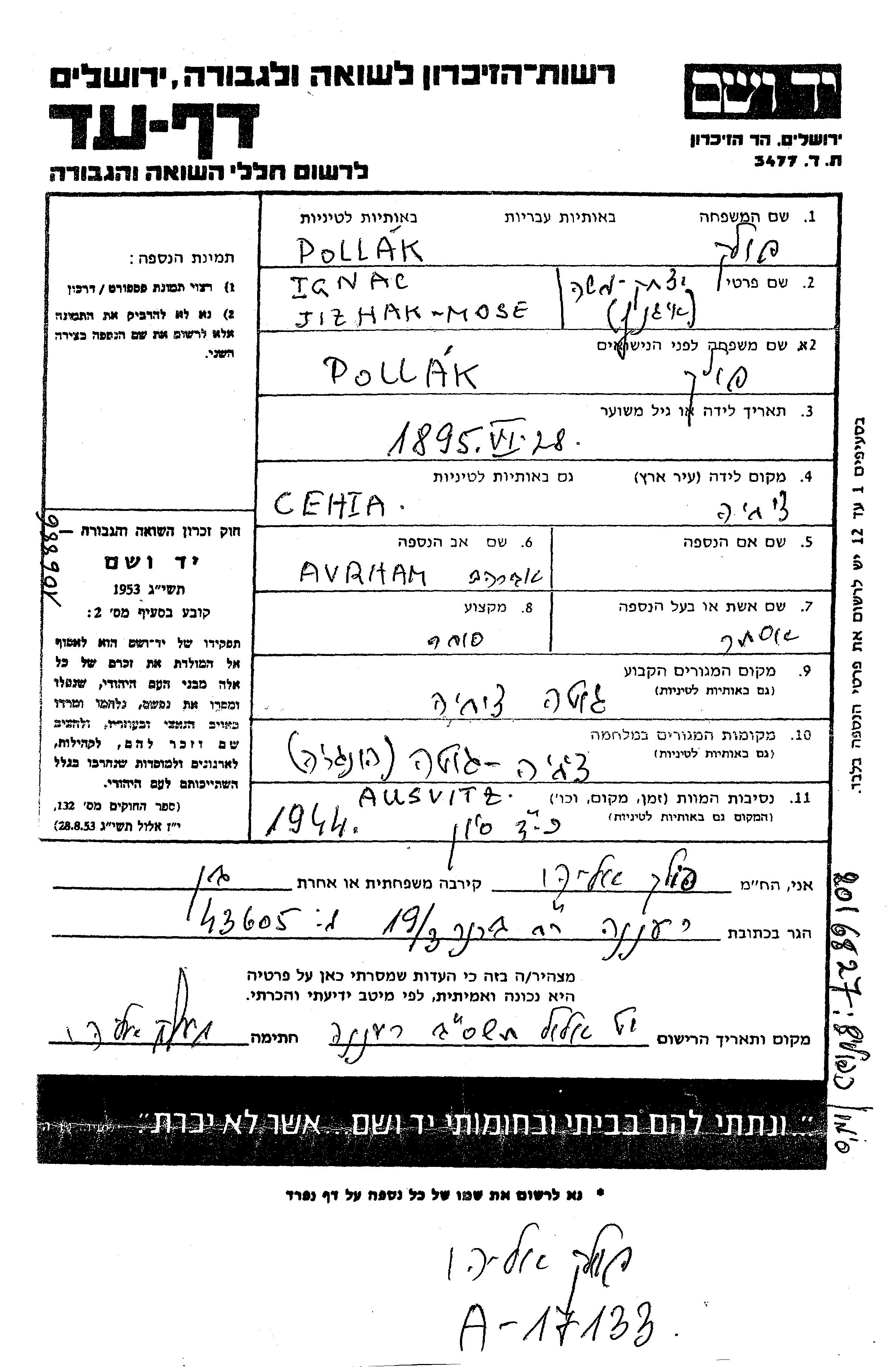 Ignac Jizhak Mose Pollak wurde im Jahr 1895 in Tschechoslowakei geboren. Er war der Sohn von Avrham. Er war Kaufmann/-frau. Vor dem Zweiten Weltkrieg lebte er in Guta, Tschechoslowakei. Während des Krieges war er in Guta, Tschechoslowakei.