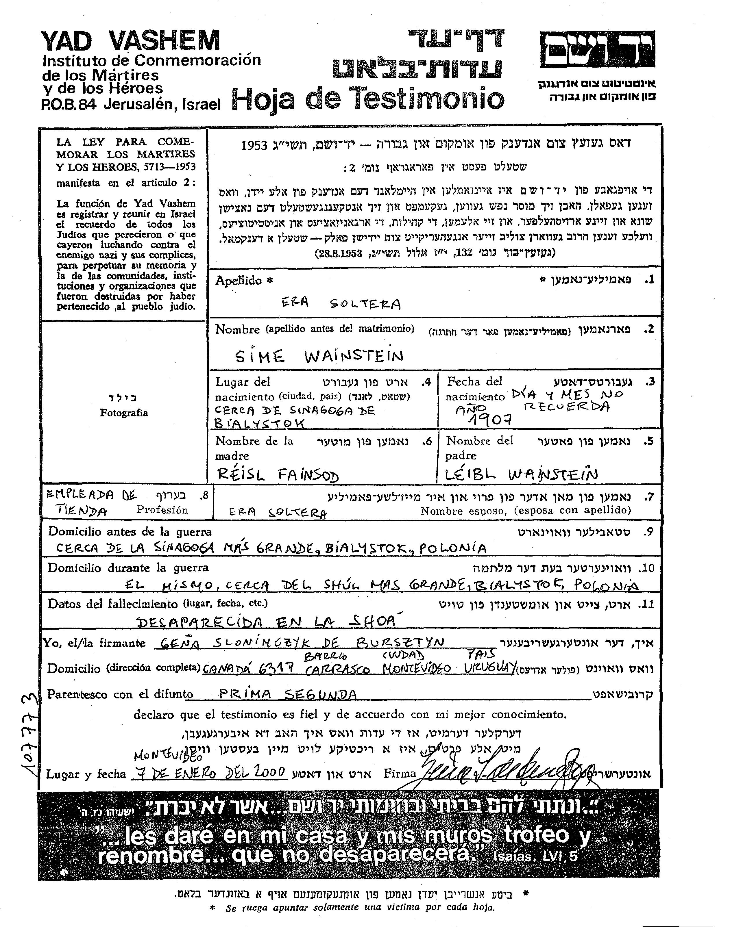 Sime Wainstein wurde im Jahr 1907 in Bialystok, Polen geboren. Sie war die Tochter von Leibl und Reisl. Sie war Angestellte/-r und Ledig. Vor dem Zweiten Weltkrieg lebte sie in Bialystok, Polen. Während des Krieges war sie in Bialystok, Polen.