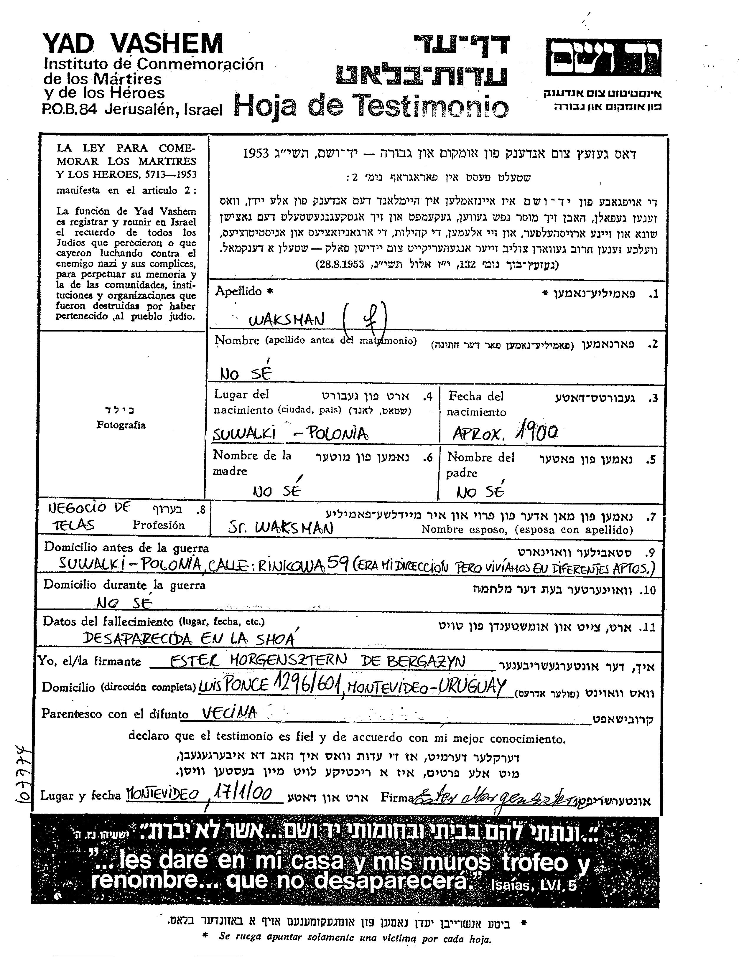 Vorname unbekannt Waksman wurde im Jahr 1900 in Suwalki, Polen geboren. Sie war Kaufmann/-frau und Verheiratet. Vor dem Zweiten Weltkrieg lebte sie in Suwalki, Polen.
