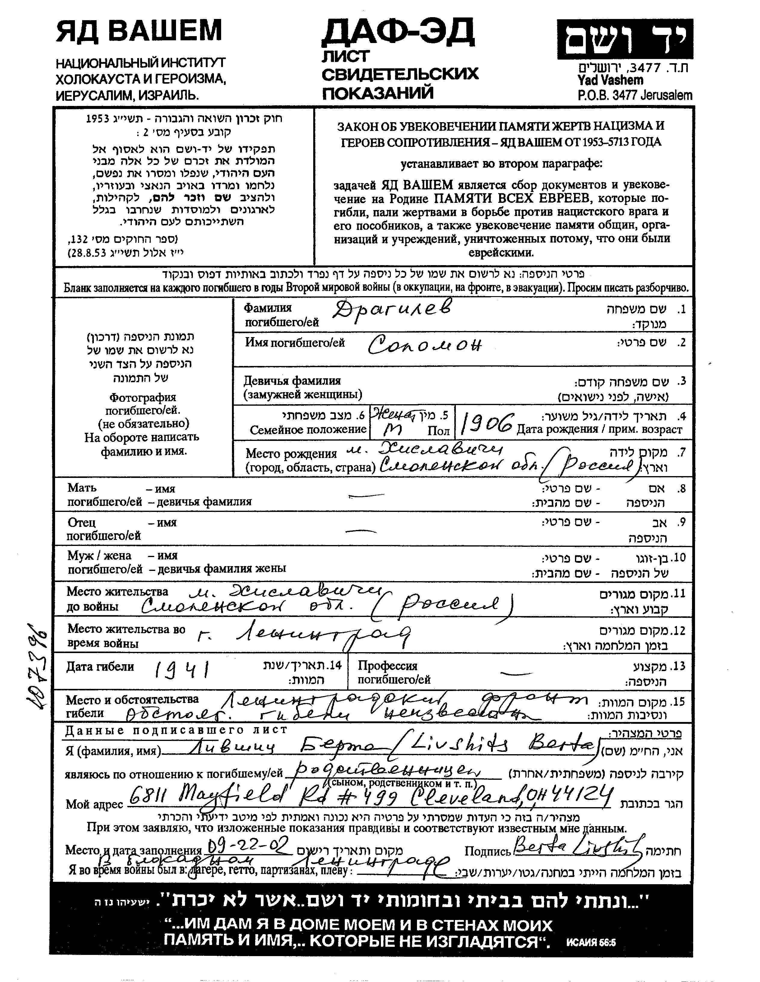 Solomon Dragilev wurde im Jahr 1906 in Khislavichi, Russland (UdSSR) geboren. Er war Verheiratet. Vor dem Zweiten Weltkrieg lebte er in Khislavichi, Russland (UdSSR). Während des Krieges war er in die Sowjetischen Streitkräfte. Solomon im Militärdienst umgekommen. Todesort: Leningrad, Russland (UdSSR) im Jahr 1941.