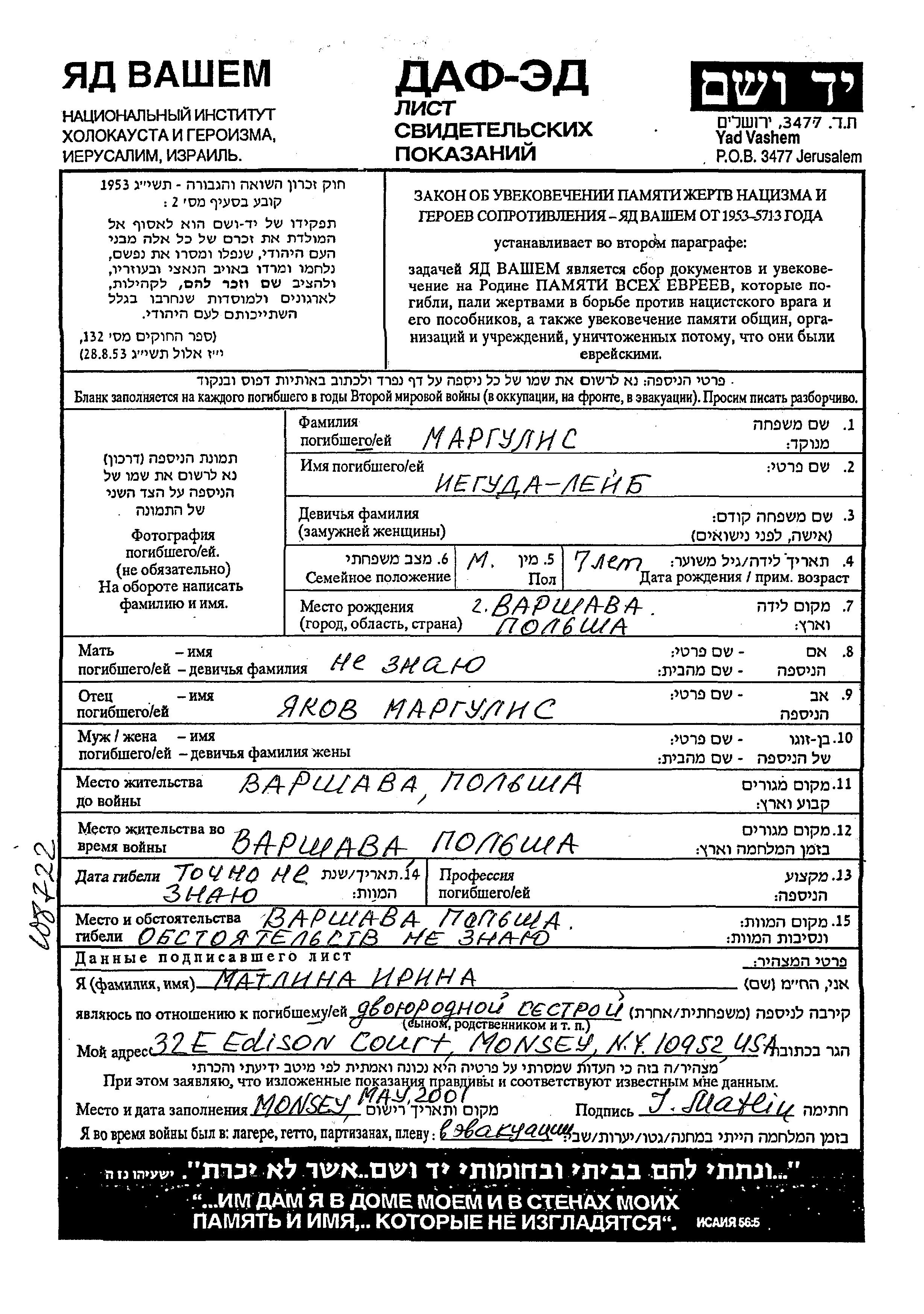Ieguda Leib Margulis wurde in Warszawa, Polen geboren. Er war der Sohn von Yakov. Er war Kind. Vor dem Zweiten Weltkrieg lebte er in Warszawa, Polen. Während des Krieges war er in Warszawa, Polen.