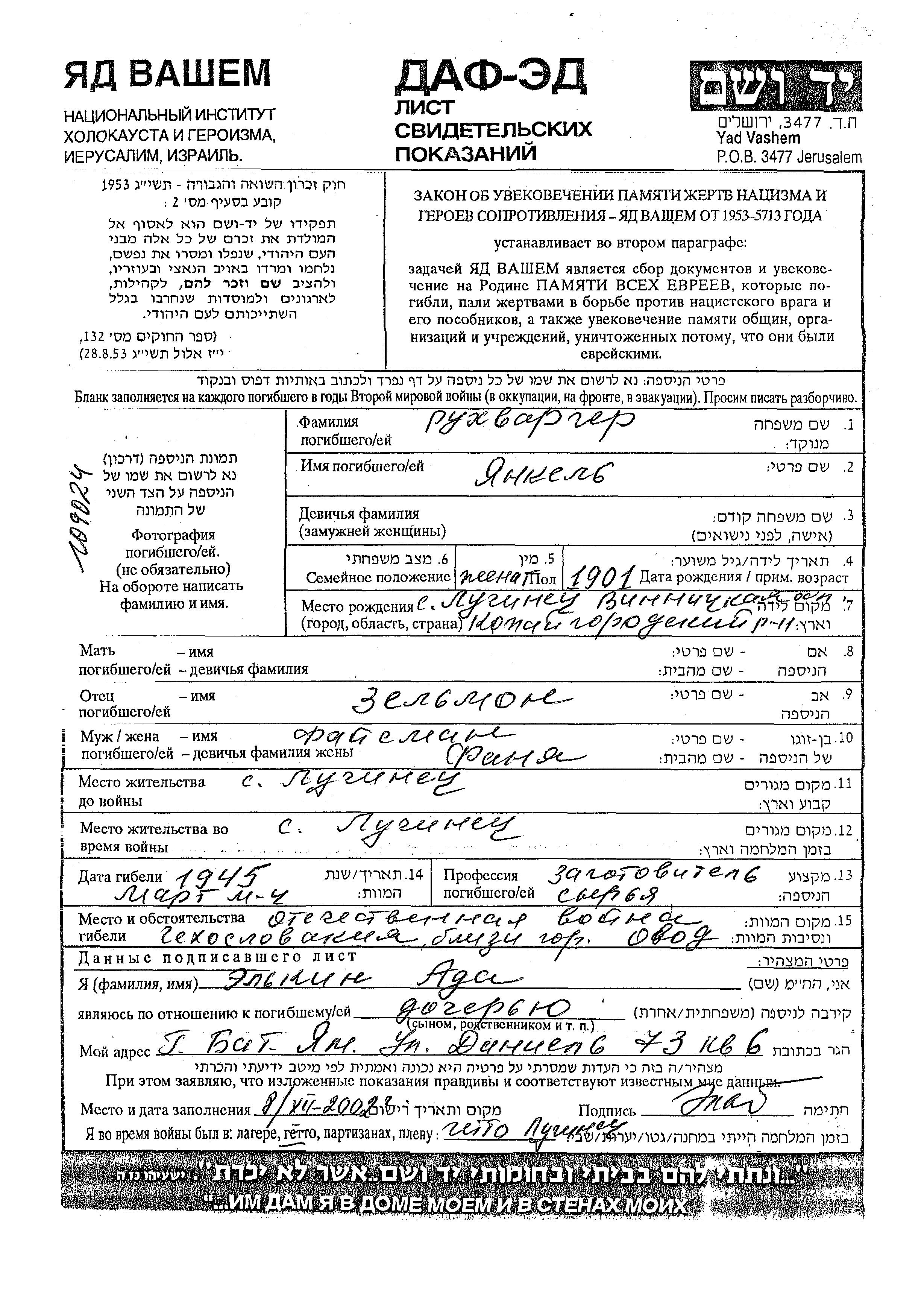 Yankel Rukhvarger wurde im Jahr 1901 in Luchinets, Ukraine (UdSSR) geboren. Er war der Sohn von Zelman. Er war Staatlicher einkäufer und mit Fanya, geb. Faisman Verheiratet. Vor dem Zweiten Weltkrieg lebte er in Luchinets, Ukraine (UdSSR). Während des Krieges war er in die Sowjetischen Streitkräfte. Yankel im Militärdienst umgekommen. Todesort: Tschechoslowakei im Jahr 1945.