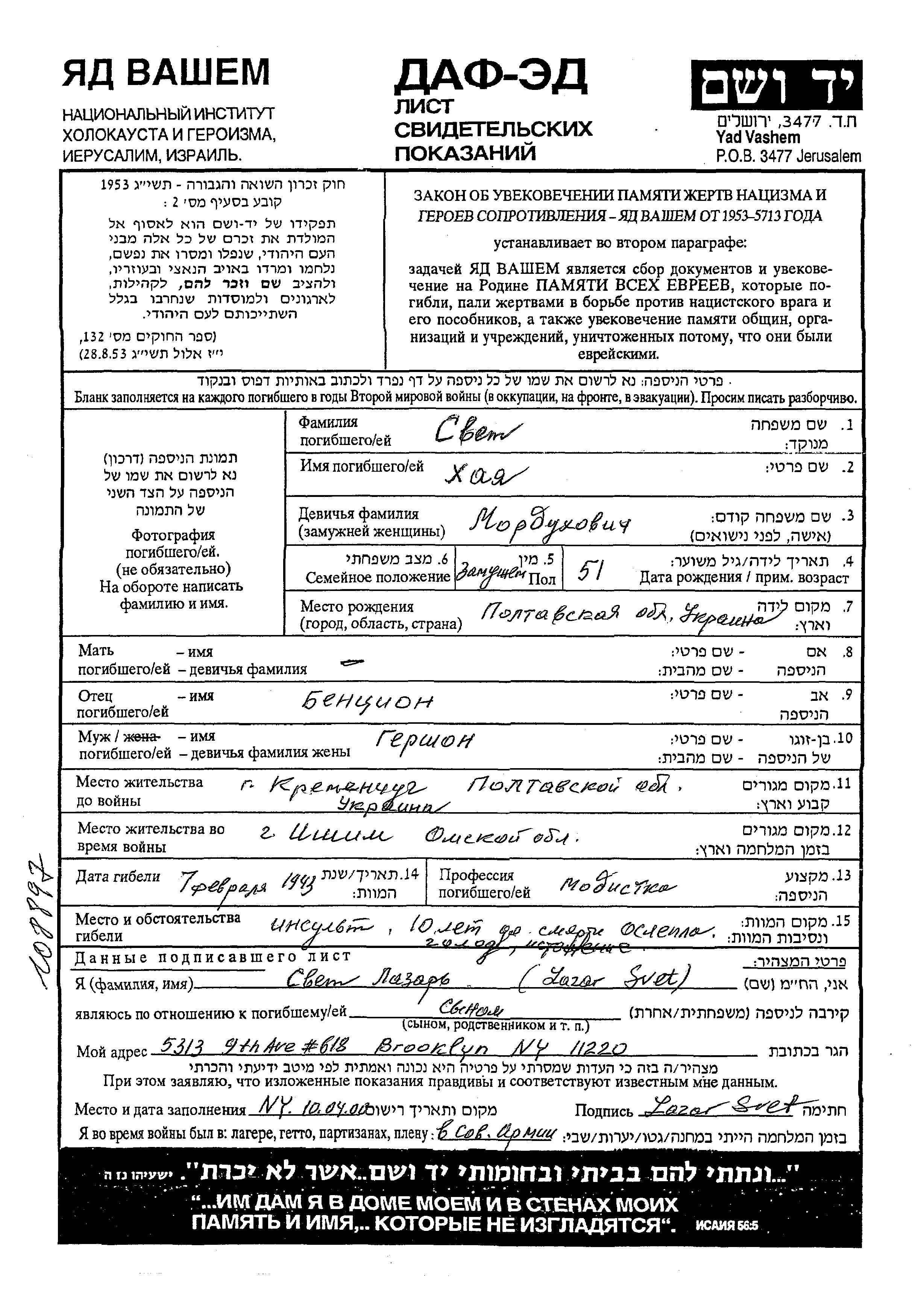 Khaia Svet, geb. Mordukhovich wurde in Poltava, Ukraine (UdSSR) geboren. Sie war die Tochter von Bentzion. Sie war Modistin und mit Gershon Verheiratet. Vor dem Zweiten Weltkrieg lebte sie in Kremenchug, Ukraine (UdSSR). Während des Krieges war sie in Ishim, Russland (UdSSR).