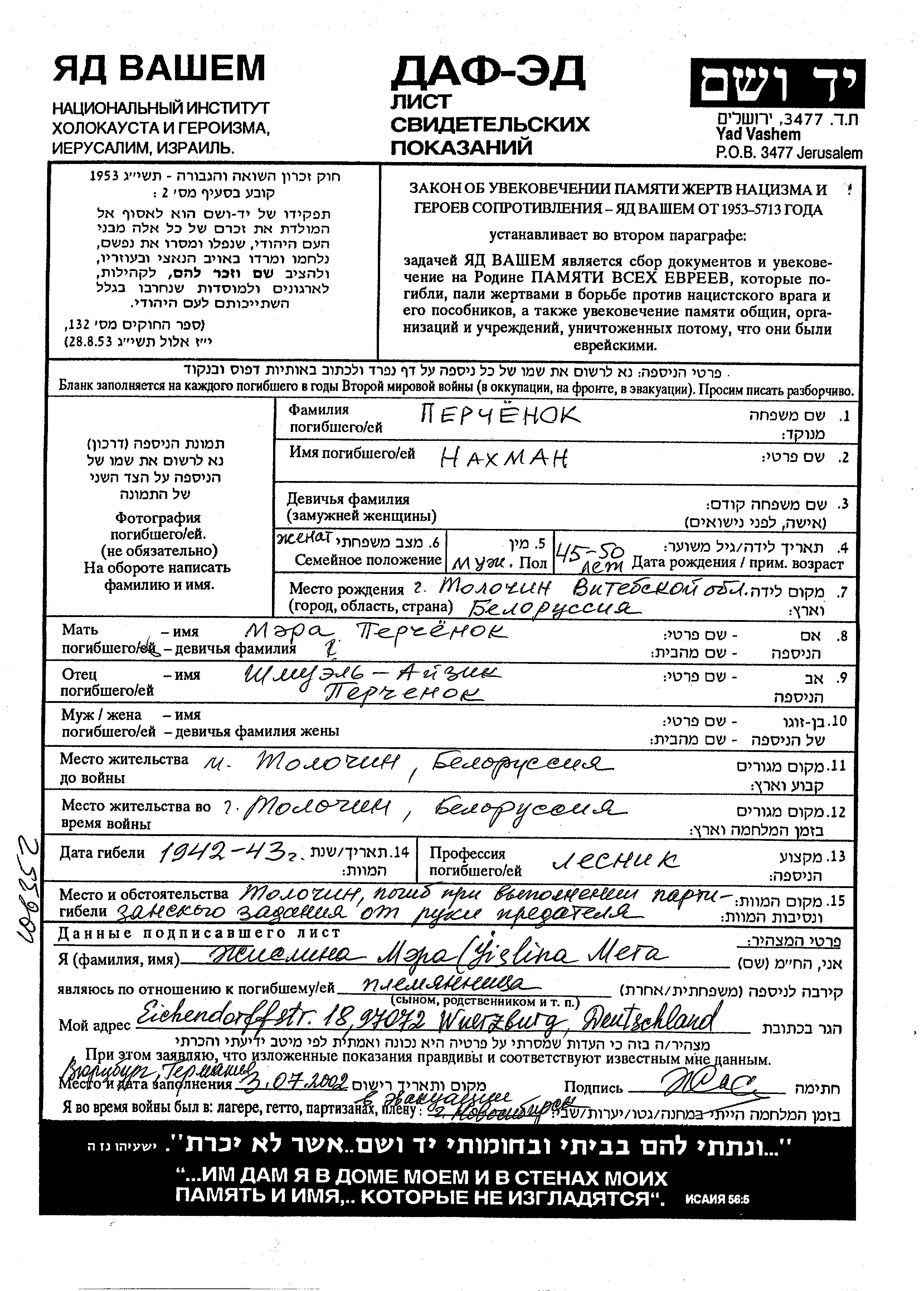 Nakhman Perchyonok wurde in Tolochin, Weißrussland (UdSSR) geboren. Er war der Sohn von Shmuel Aizik und Mera. Er war Förster und Verheiratet. Vor dem Zweiten Weltkrieg lebte er in Tolochin, Weißrussland (UdSSR). Während des Krieges war er in Tolochin, Weißrussland (UdSSR).