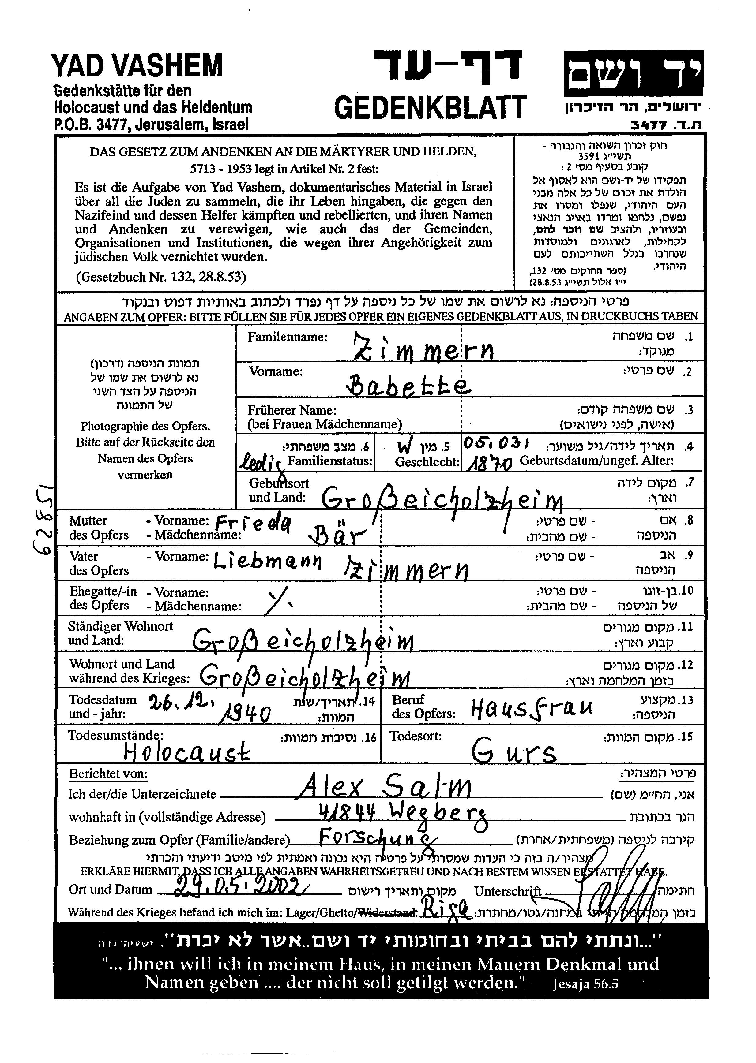 Babette Zimmern wurde im Jahr 1870 in Grosseicholzheim, Deutsches Reich geboren. Sie war die Tochter von Liebmann und Frieda. Sie war Hausfrau und Ledig. Vor dem Zweiten Weltkrieg lebte sie in Grosseicholzheim, Deutsches Reich. Während des Krieges war sie in Grosseicholzheim, Deutsches Reich. Babette wurde in der Schoah ermordet. Todesort: Gurs, Frankreich im Jahr 1940.