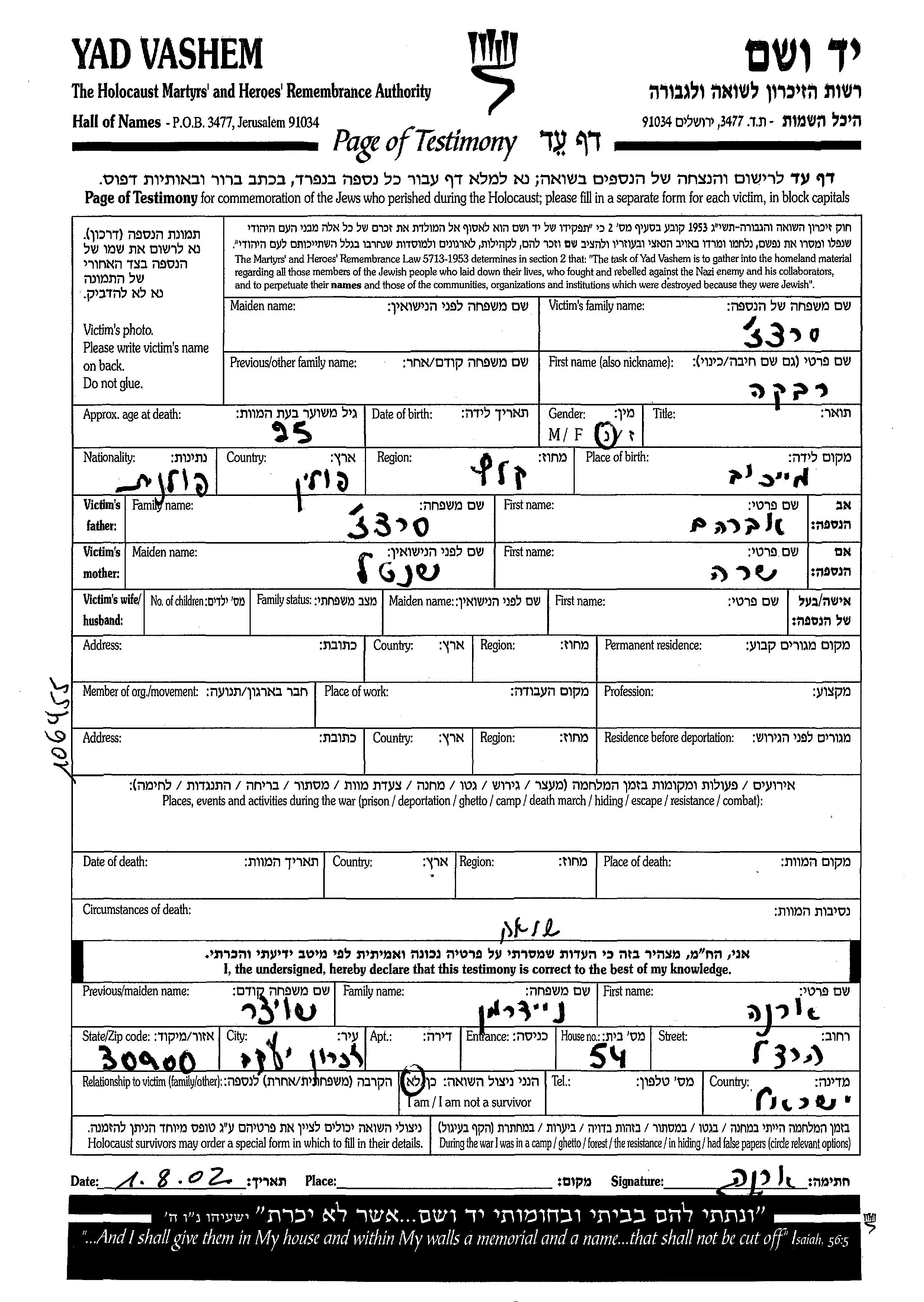 Sertzash Rivka unbekannter Ort, Gedenkblatt