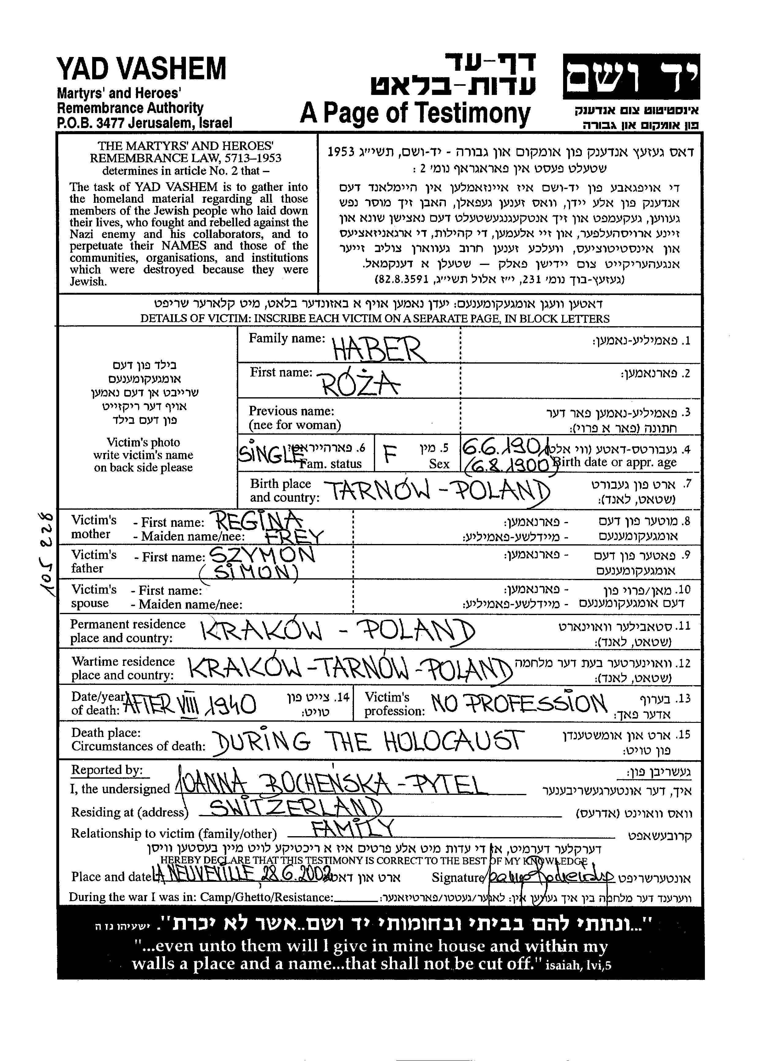 Roza Haber wurde im Jahr 1901 in Tarnow, Polen geboren. Sie war die Tochter von Szymon und Regina. Sie war Ledig. Vor dem Zweiten Weltkrieg lebte sie in Krakow, Polen. Während des Krieges war sie in Krakow, Polen.