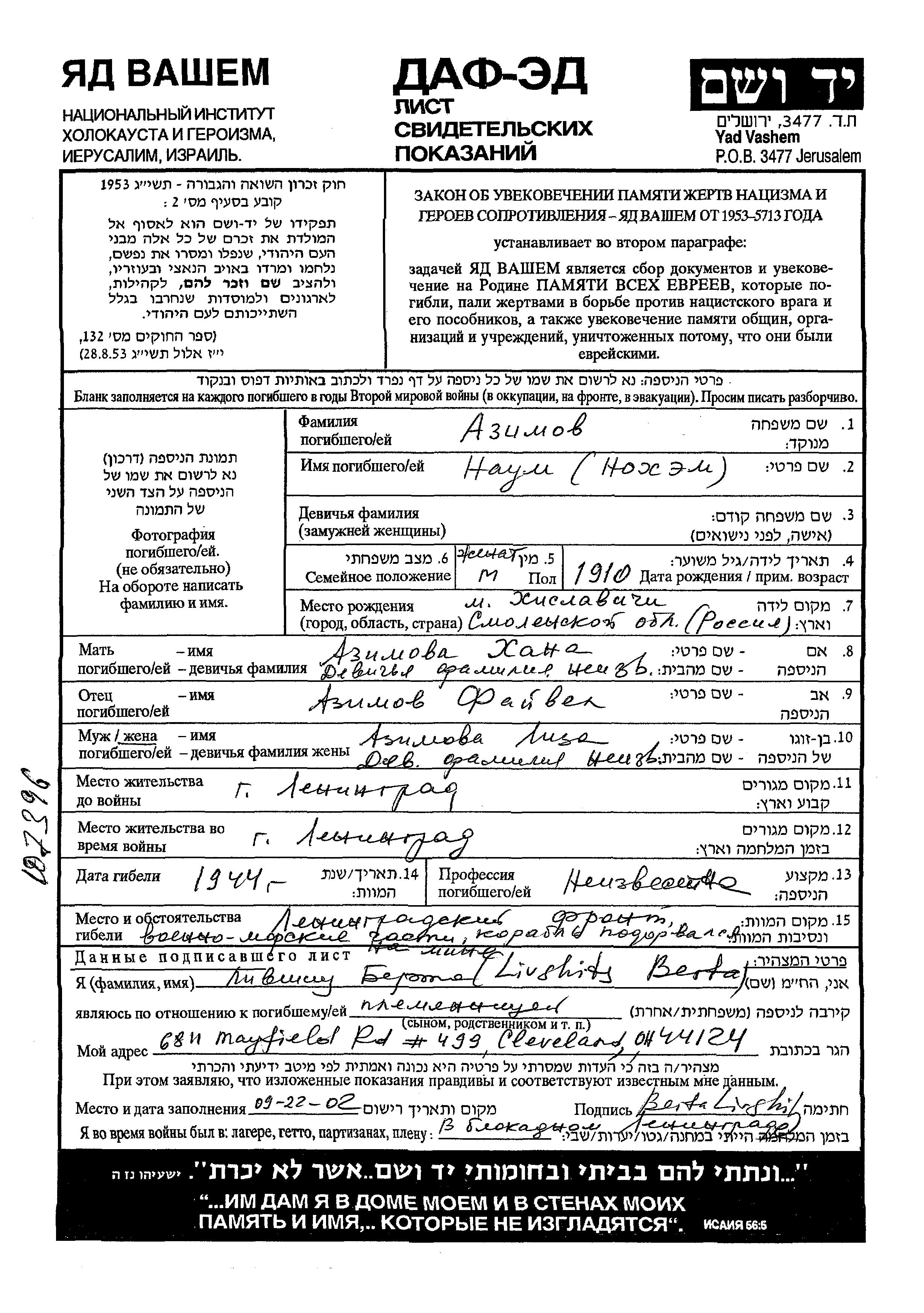 Nakhum Azimov wurde im Jahr 1910 in Khislavichi, Russland (UdSSR) geboren. Er war der Sohn von Faivel und Khana. Er war mit Liza Verheiratet. Vor dem Zweiten Weltkrieg lebte er in Leningrad, Russland (UdSSR). Während des Krieges war er in die Sowjetischen Streitkräfte. Nakhum im Militärdienst umgekommen. Todesort: Leningrad, Russland (UdSSR) im Jahr 1944.