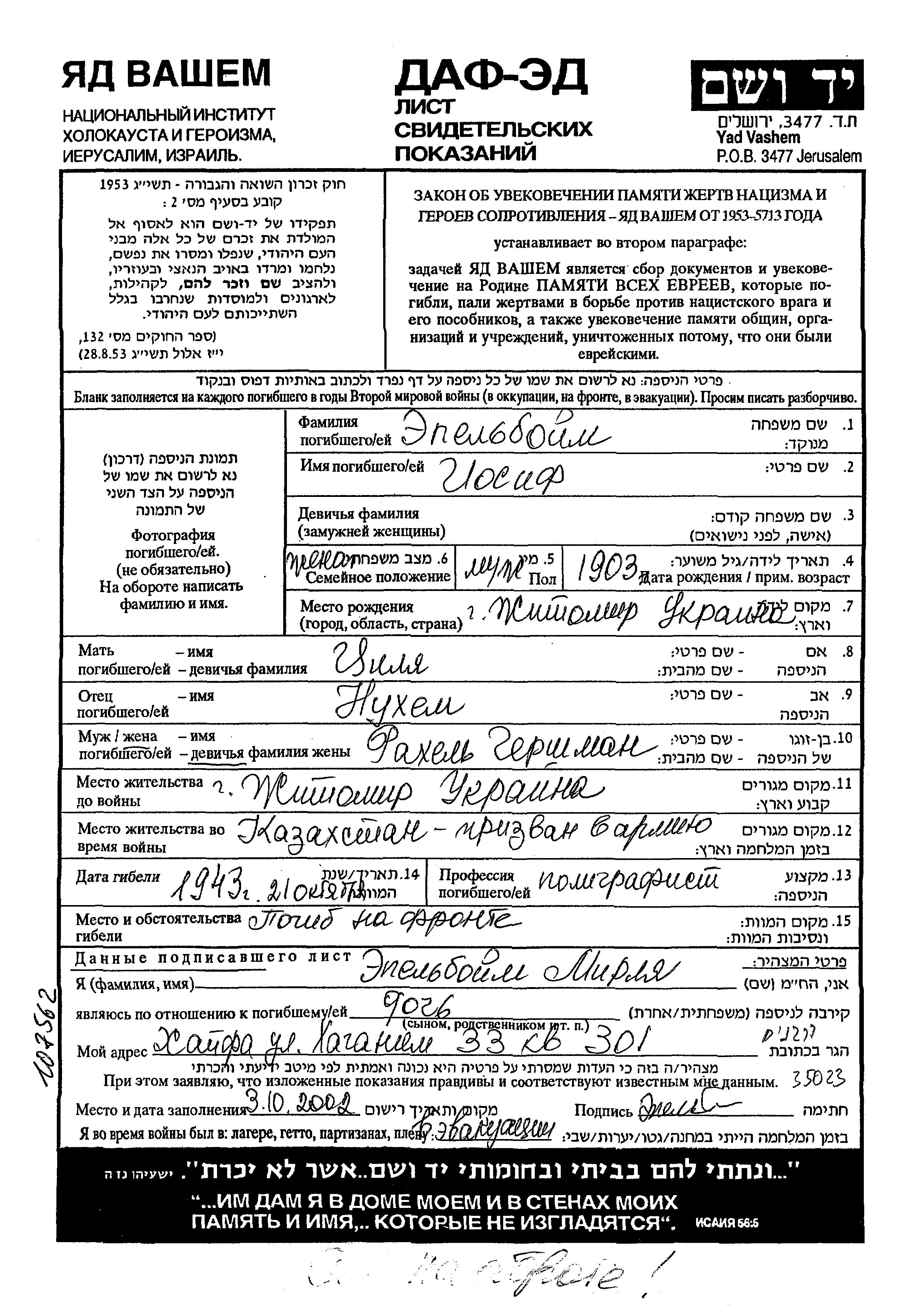 Iosif Epelboim wurde im Jahr 1903 in Zhitomir, Ukraine (UdSSR) geboren. Er war der Sohn von Nukhem und Tzilya. Er war Drucker und mit Rakhel, geb. Gershman Verheiratet. Vor dem Zweiten Weltkrieg lebte er in Zhitomir, Ukraine (UdSSR). Während des Krieges war er in die Sowjetischen Streitkräfte. Iosif im Militärdienst umgekommen. Todesort: unbekannt im Jahr 1943.