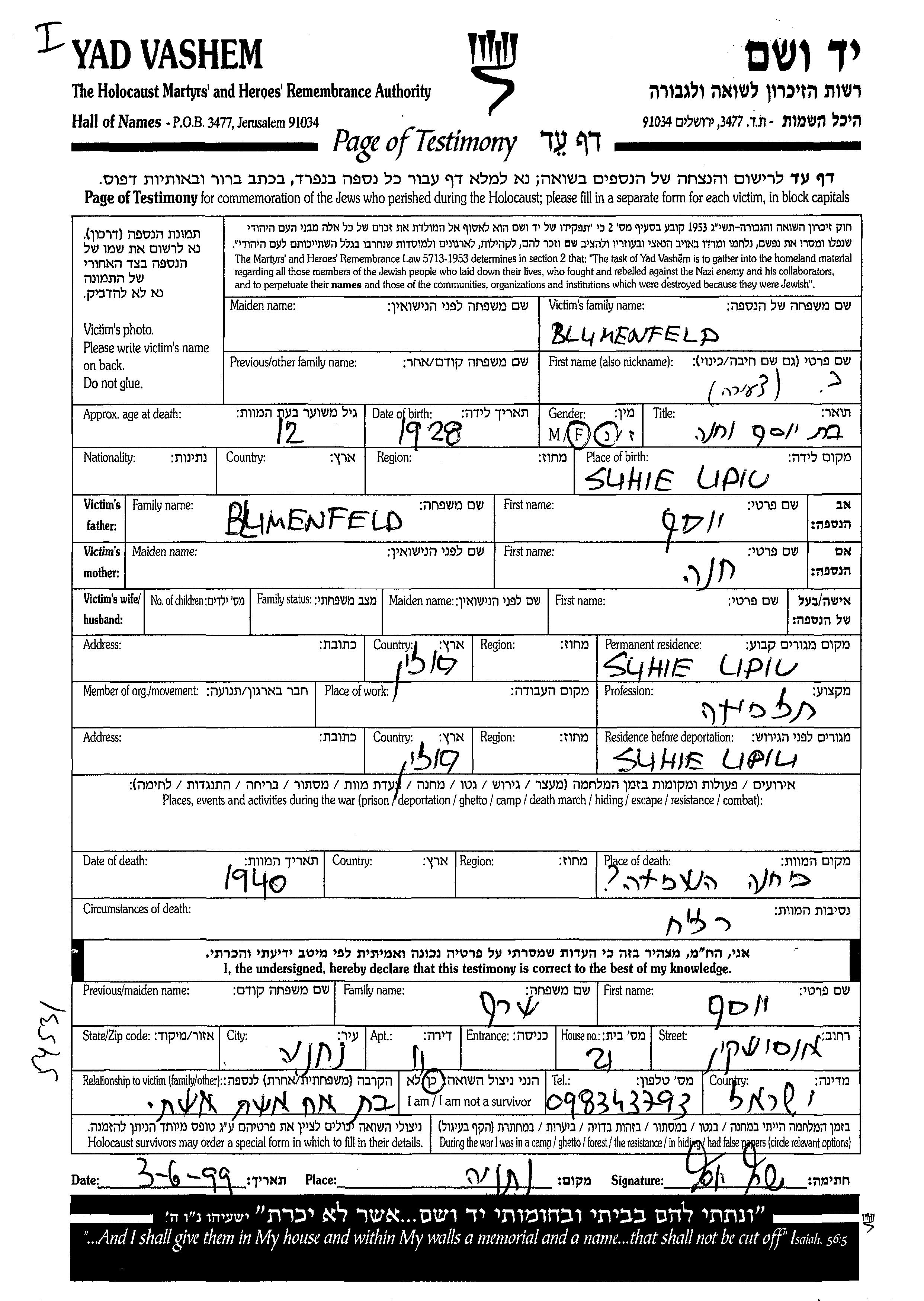 Vorname unbekannt Blumenfeld wurde im Jahr 1928 in Suchelipie, Polen geboren. Sie war die Tochter von Yosef und Khana. Sie war Schüler/-in und Kind. Vor dem Zweiten Weltkrieg lebte sie in Suchelipie, Polen. Während des Krieges war sie in Suchelipie, Polen.