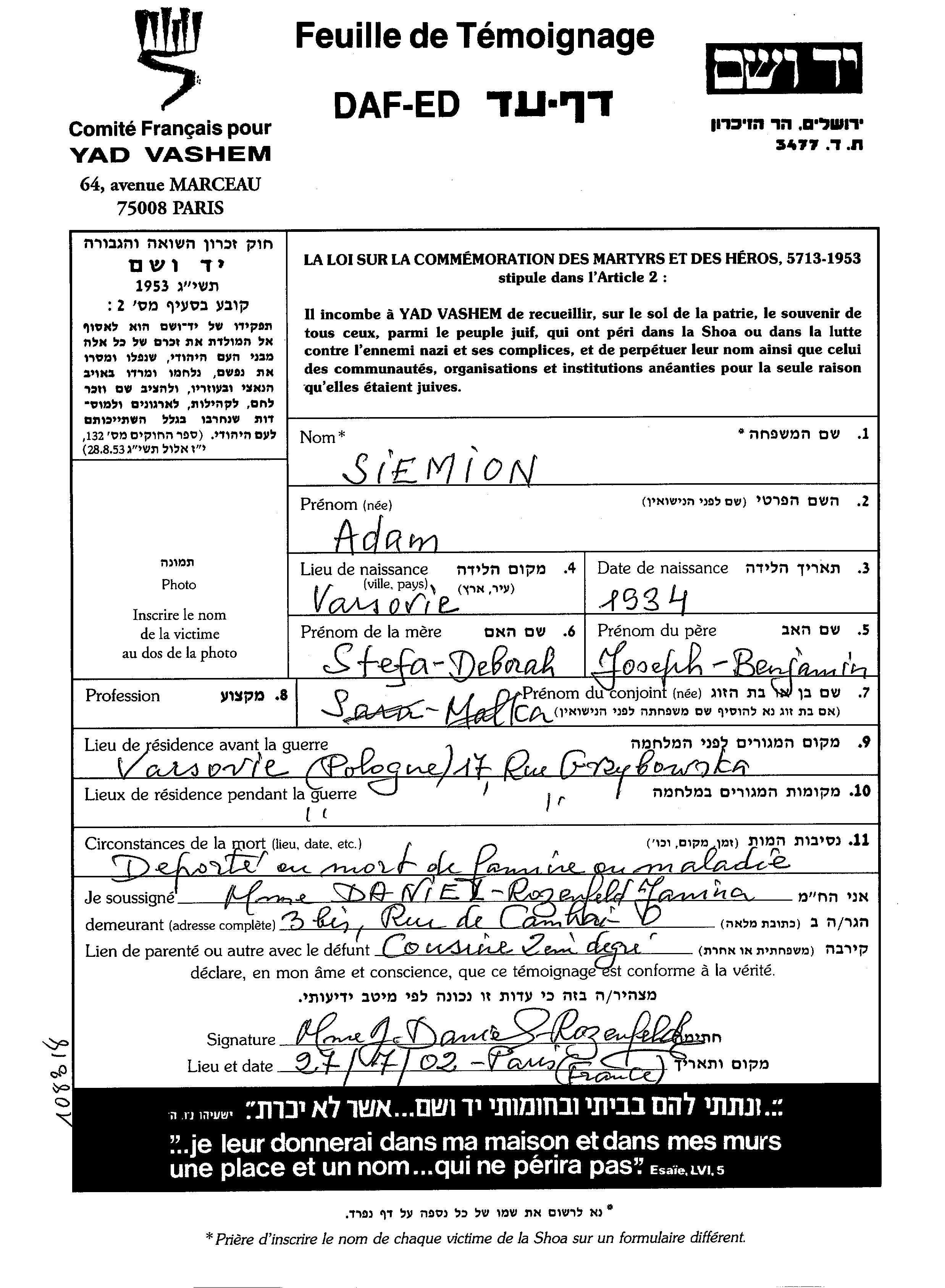 Adam Siemion wurde im Jahr 1934 in Varsha, Polen geboren. Er war der Sohn von Joseph Benjamin und Stefa Deborah. Vor dem Zweiten Weltkrieg lebte er in Varsha, Polen. Während des Krieges war er in Varsha, Polen.