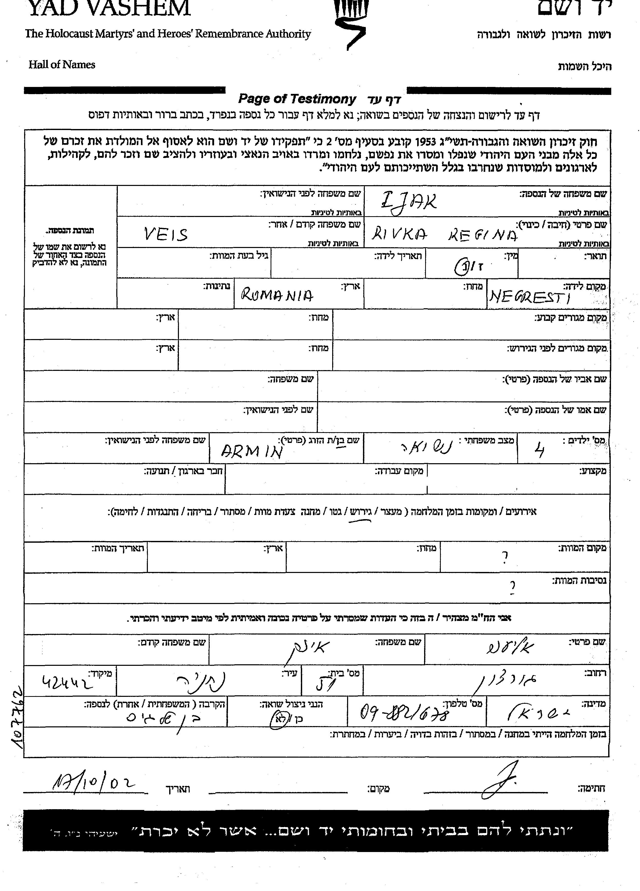 Rivka Regina Ijak, geb. Veis wurde in Negresti, Rumänien geboren. Sie war mit Armin Verheiratet.