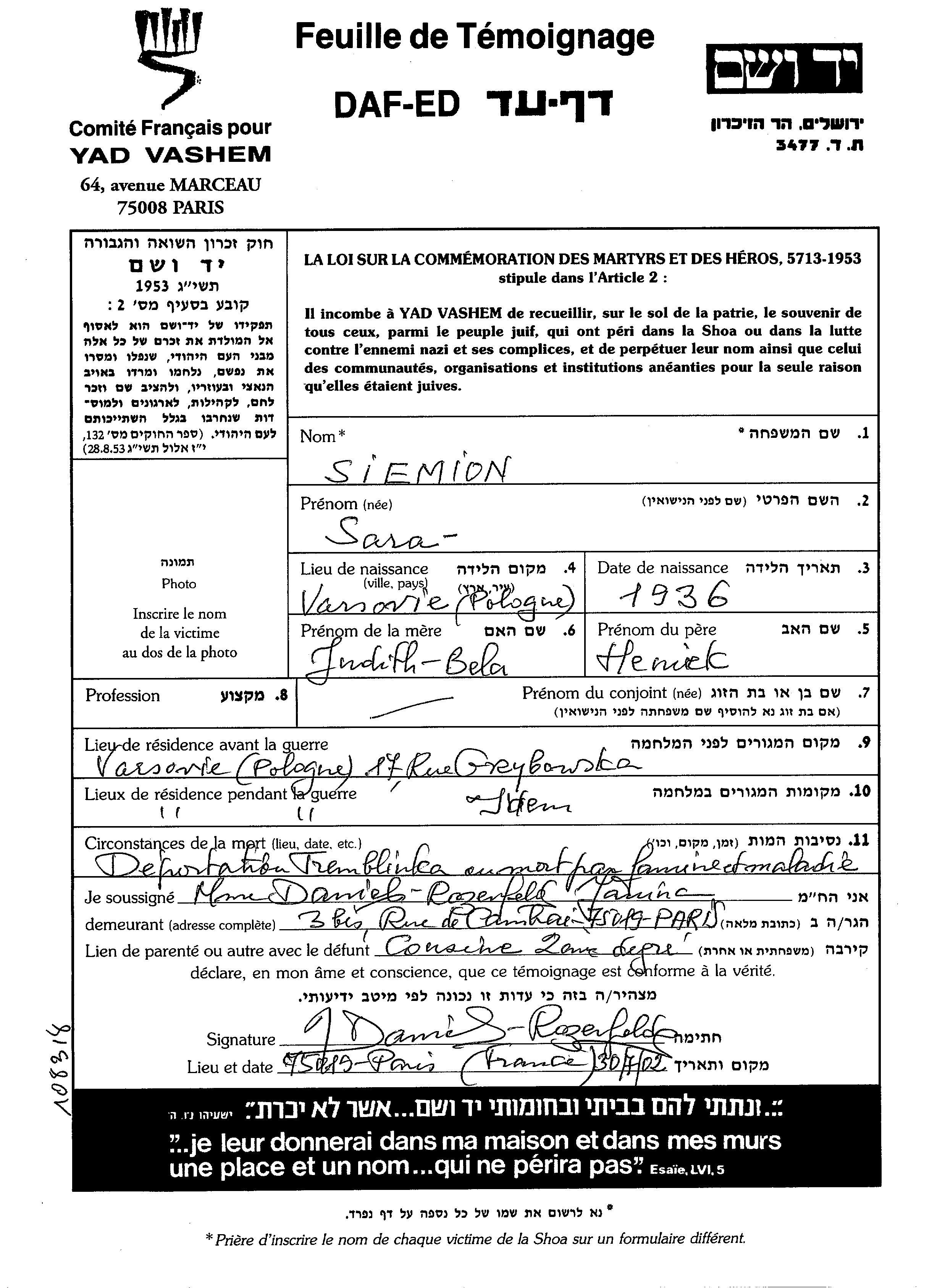 Sara Siemion wurde im Jahr 1936 in Varsha, Polen geboren. Sie war die Tochter von Henick und Judith Bela. Vor dem Zweiten Weltkrieg lebte sie in Varsha, Polen. Während des Krieges war sie in Varsha, Polen.
