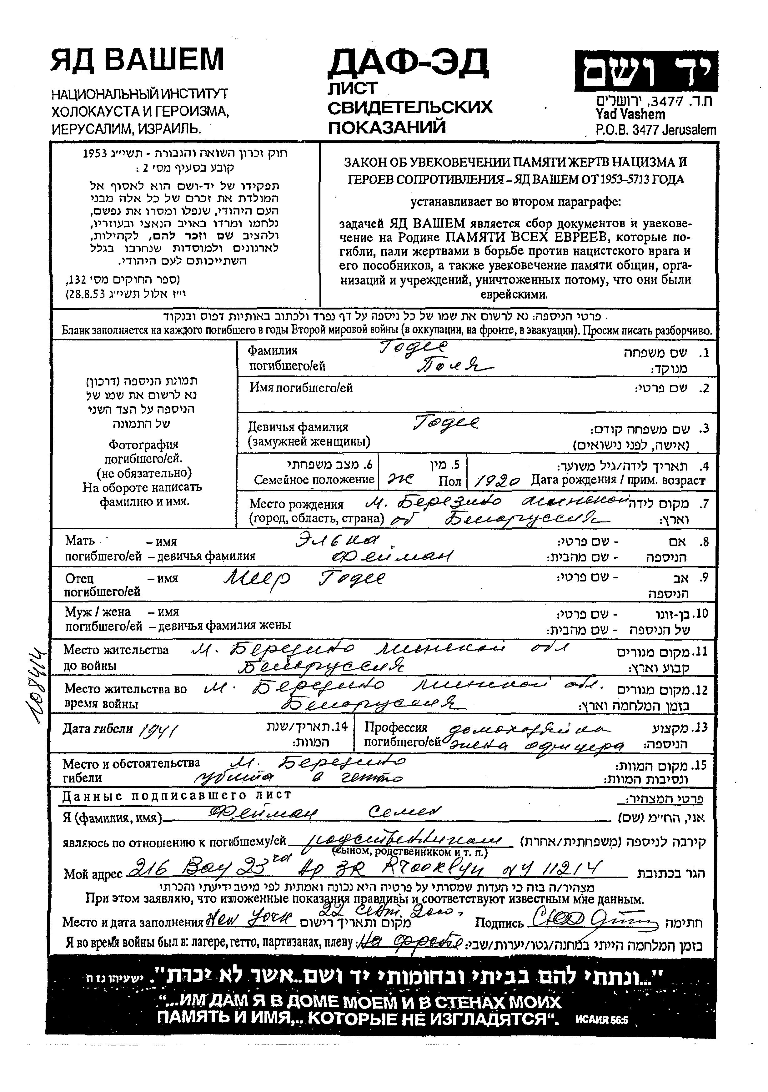 Polya Godes wurde im Jahr 1920 in Berezino, Weißrussland (UdSSR) geboren. Sie war die Tochter von Meer und Elka. Sie war Hausfrau und Verheiratet. Vor dem Zweiten Weltkrieg lebte sie in Berezino, Weißrussland (UdSSR). Während des Krieges war sie in Berezino, Weißrussland (UdSSR).