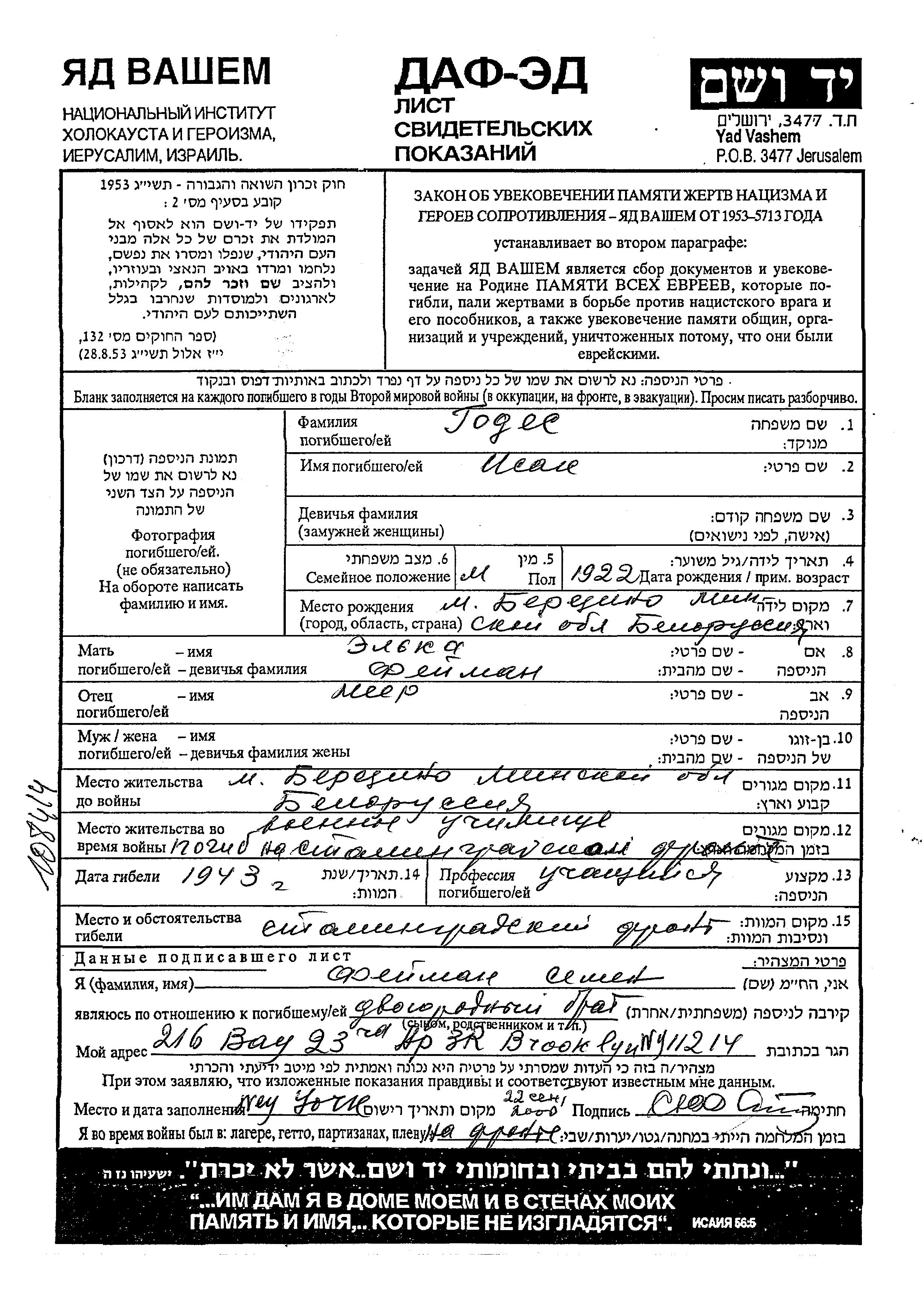 Isak Godes wurde im Jahr 1922 in Berezino, Weißrussland (UdSSR) geboren. Er war der Sohn von Meer und Elka. Er war Schüler/-in und Ledig. Vor dem Zweiten Weltkrieg lebte er in Berezino, Weißrussland (UdSSR). Während des Krieges war er in die Sowjetischen Streitkräfte. Isak im Militärdienst umgekommen. Todesort: Stalingrad, Russland (UdSSR) im Jahr 1943.