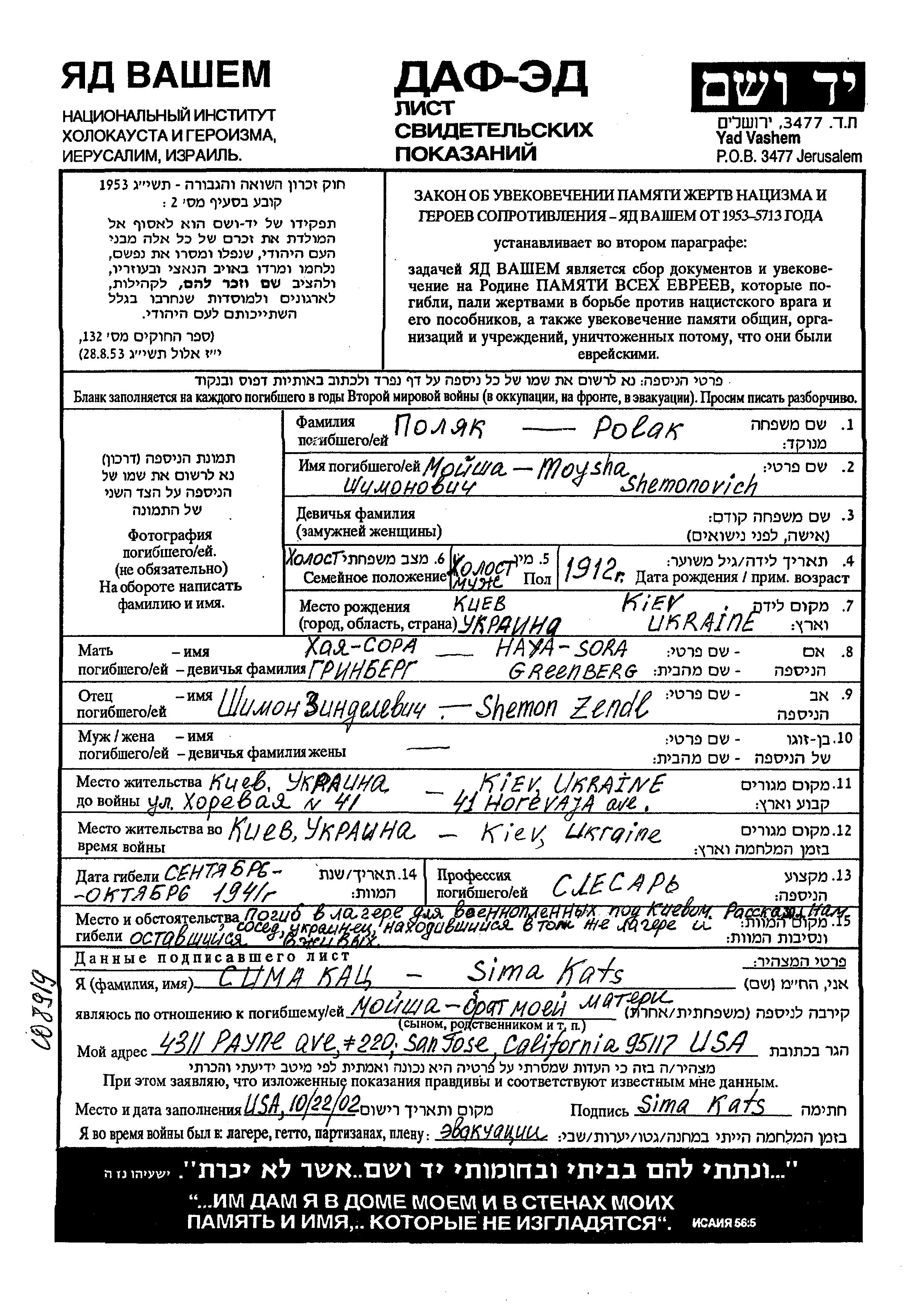 Moysha Polak wurde im Jahr 1912 in Kiev, Ukraine (UdSSR) geboren. Er war der Sohn von Shemon und Haya Sora. Er war Schlosser und Ledig. Vor dem Zweiten Weltkrieg lebte er in Kiev, Ukraine (UdSSR). Während des Krieges war er in Kiev, Ukraine (UdSSR).