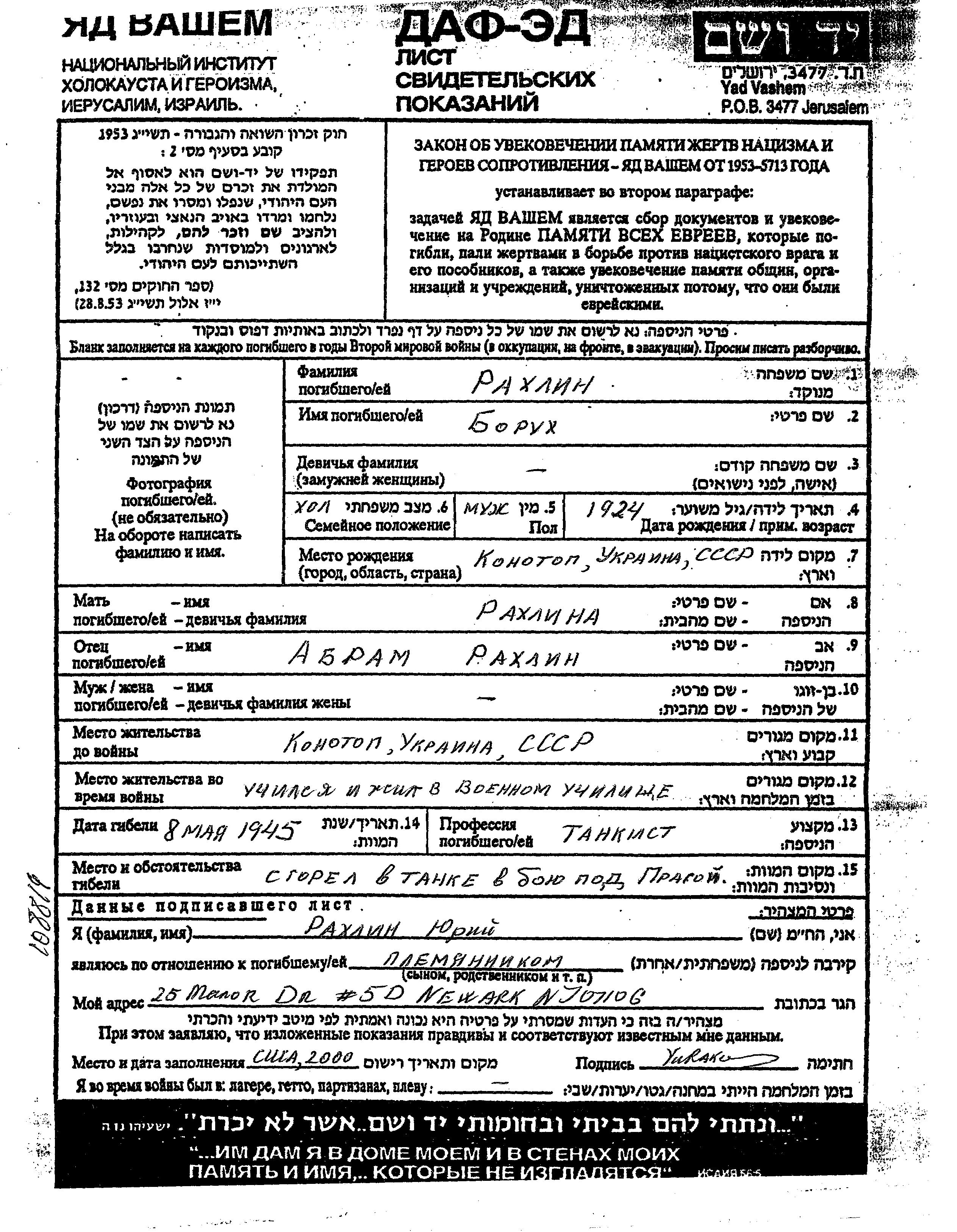 Rakhlin Barukh 1924 Konotop, Ukraine (UdSSR) Gedenkblatt