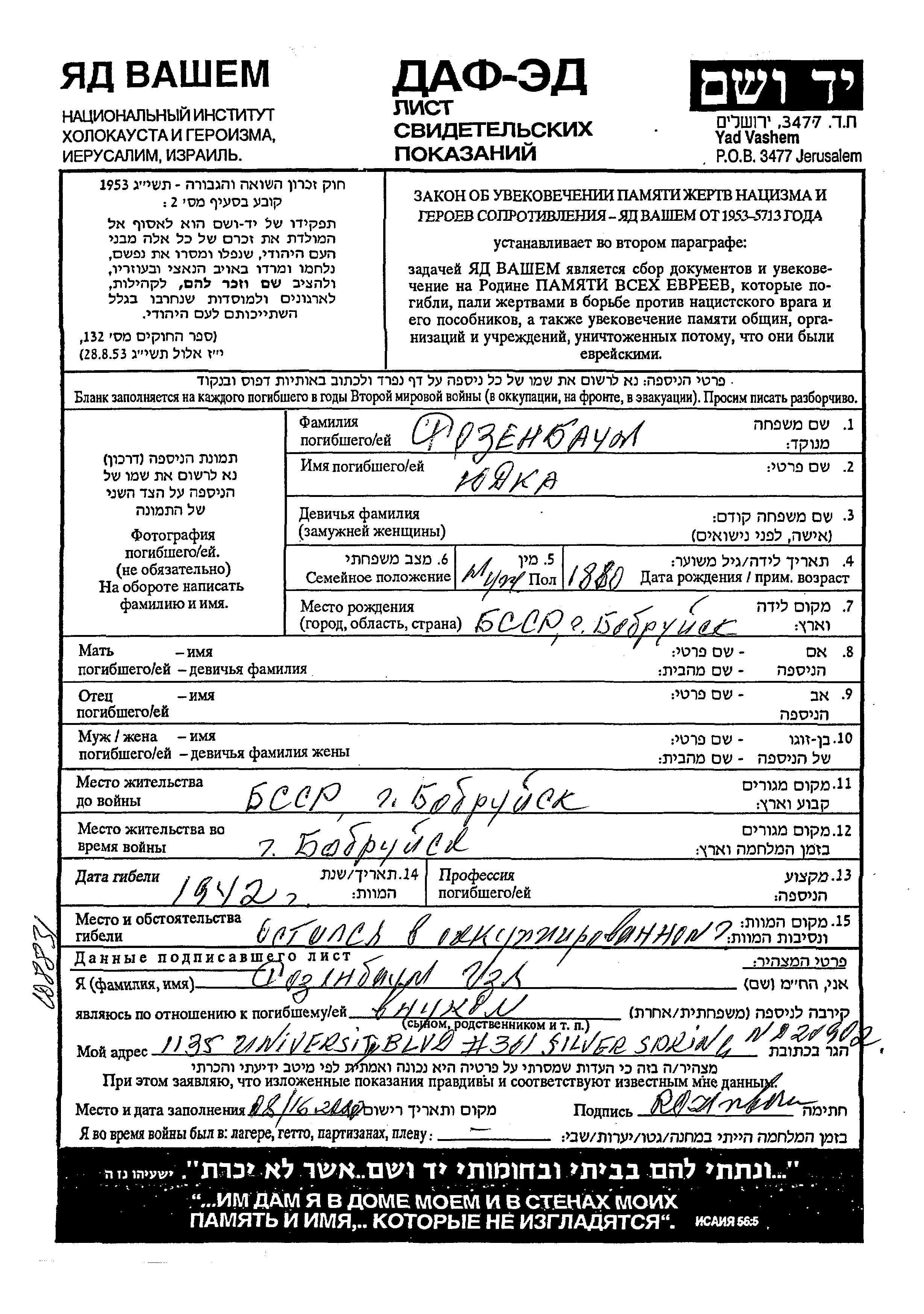 Yudka Rozenbaum wurde im Jahr 1880 in Bobruysk, Weißrussland (UdSSR) geboren. Vor dem Zweiten Weltkrieg lebte er in Bobruysk, Weißrussland (UdSSR). Während des Krieges war er in Bobruysk, Weißrussland (UdSSR).