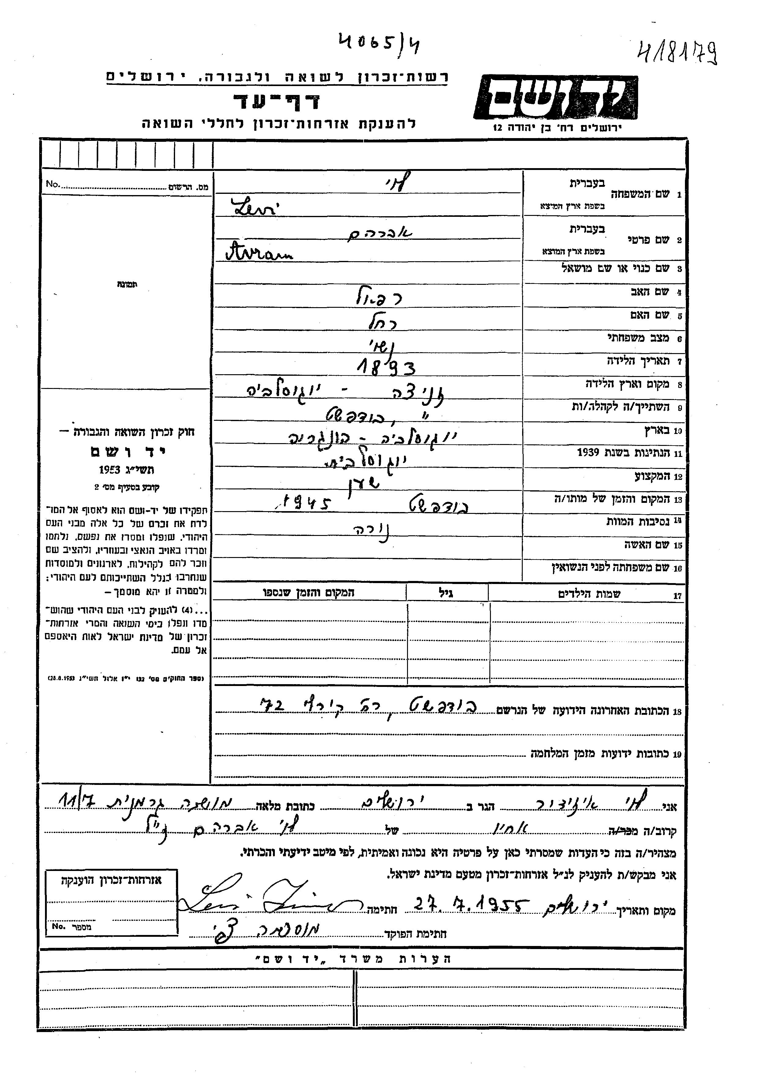 Avram Levi wurde im Jahr 1893 in Zenica, Jugoslawien geboren. Er war der Sohn von Rafael und Rakhel. Er war Uhrmacher/-in. Während des Krieges war er in Budapest, Ungarn.