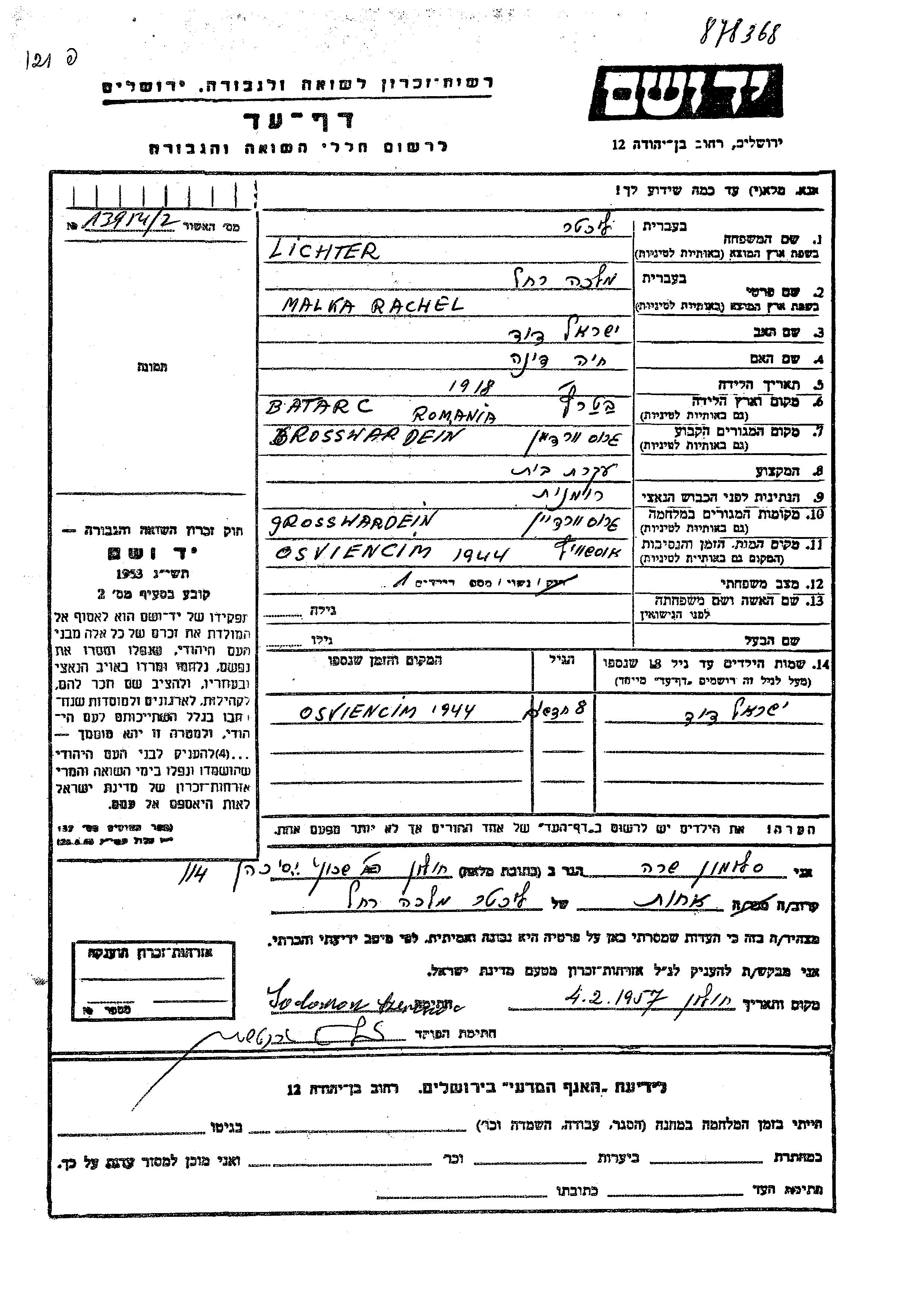 Rachel Malka Lichter wurde im Jahr 1918 in Batarci, Rumänien geboren. Sie war die Tochter von Yisrael David und Khaia Dina. Sie war Hausfrau und Verheiratet. Vor dem Zweiten Weltkrieg lebte sie in Grosswardein, Rumänien. Während des Krieges war sie in Grosswardein, Rumänien.