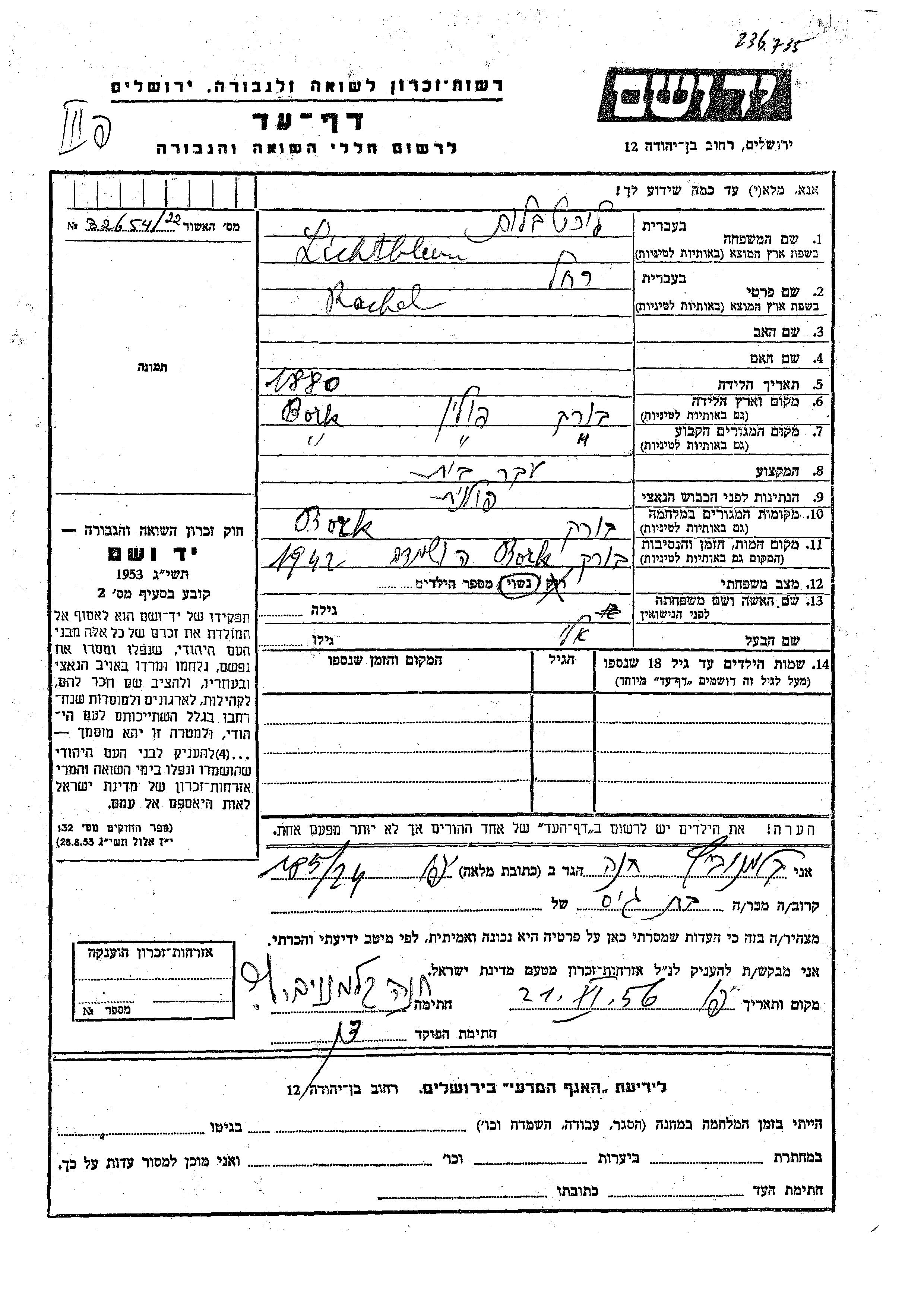 Rachel Lichtenbaum Likhtblum wurde im Jahr 1880 in Borki, Polen geboren. Sie war Hausfrau und mit Eli Verheiratet. Vor dem Zweiten Weltkrieg lebte sie in Borki, Polen. Während des Krieges war sie in Borki, Polen.