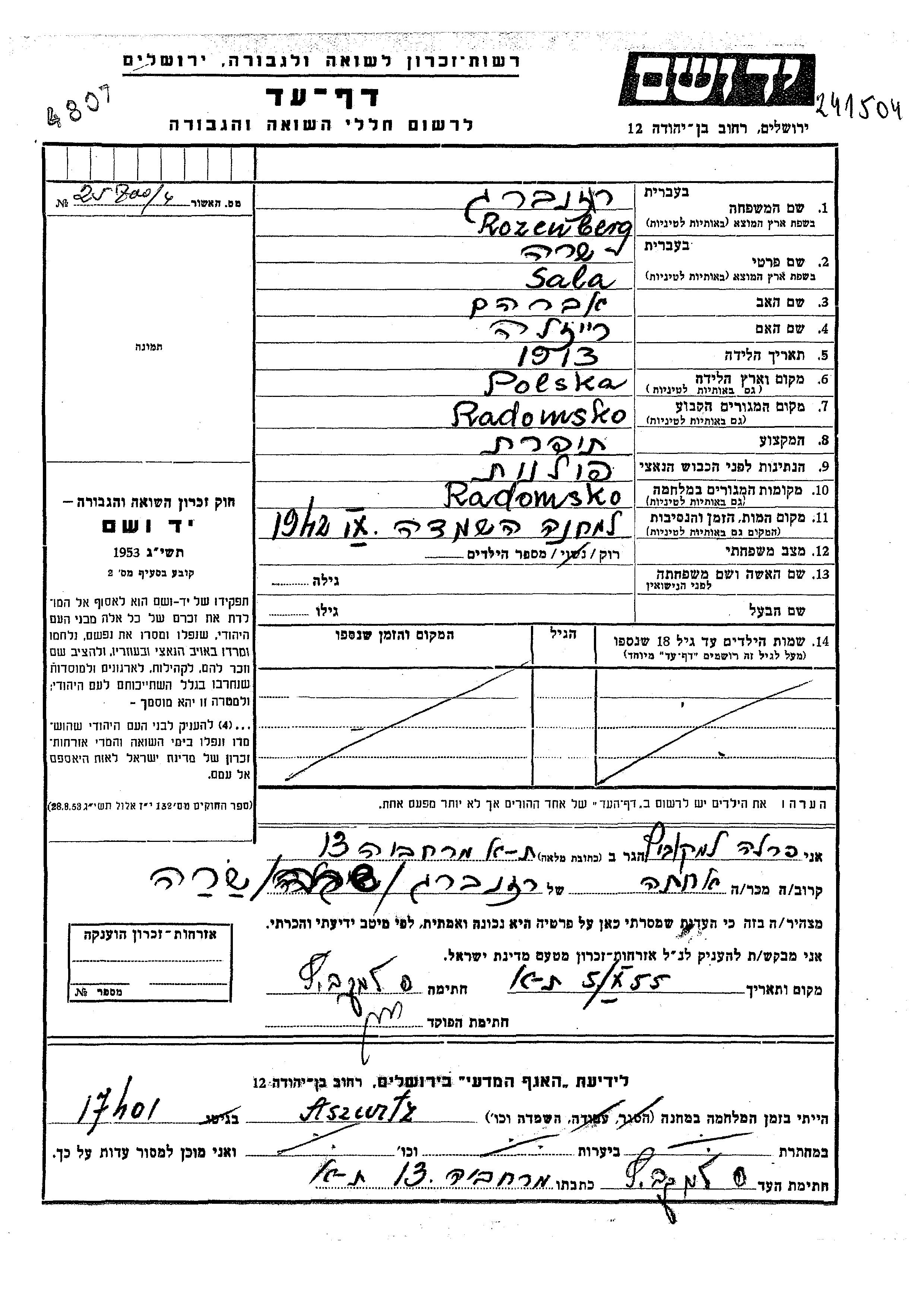 Sala Sara Rozenberg wurde im Jahr 1913 in Polen geboren. Sie war die Tochter von Avraham und Raizla. Sie war Schneiderin und Ledig. Während des Krieges war sie in Radomsko, Polen.