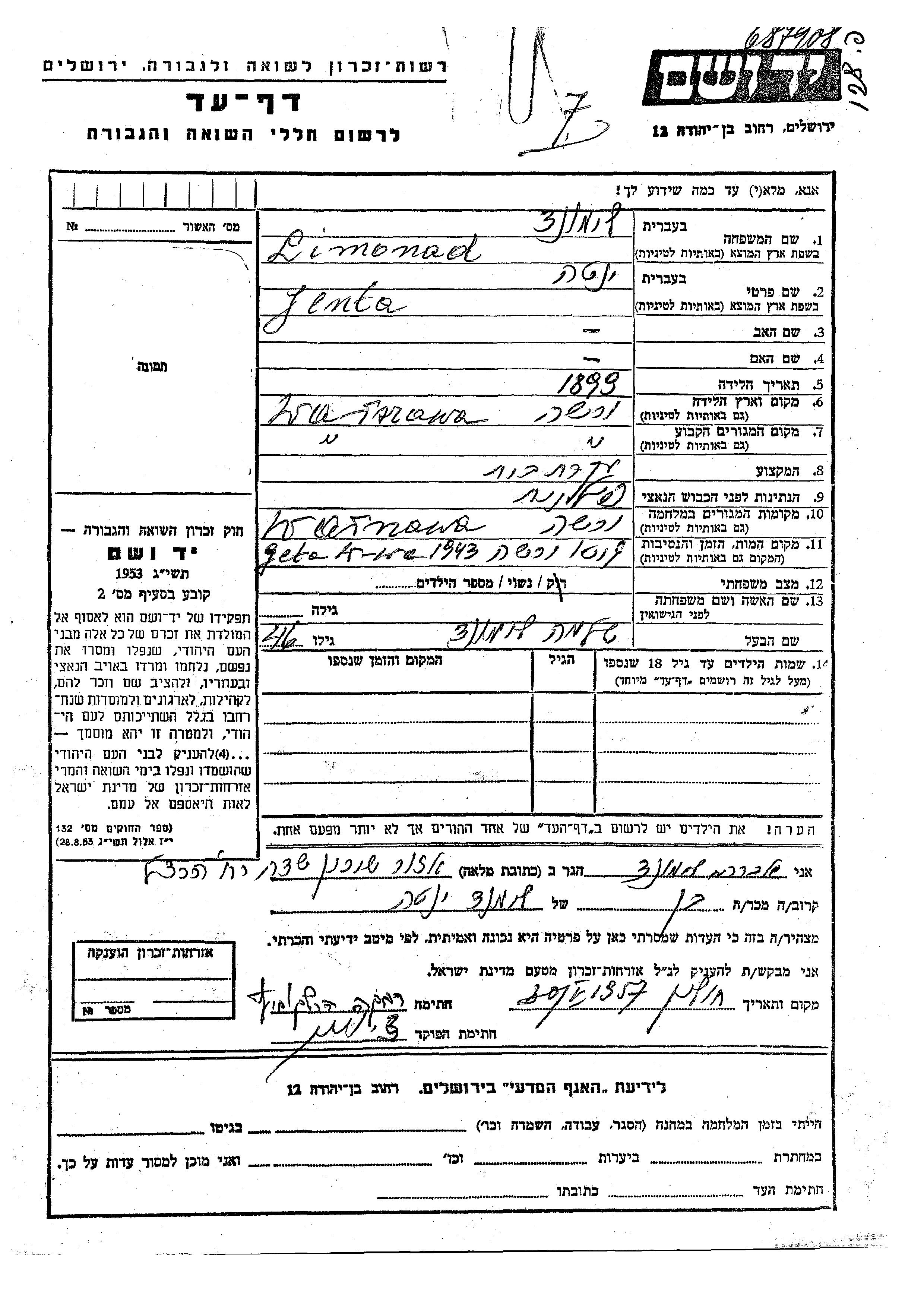 Yenta Limonad wurde im Jahr 1899 in Warszawa, Polen geboren. Sie war Hausfrau und mit Shlomo Verheiratet. Vor dem Zweiten Weltkrieg lebte sie in Warszawa, Polen. Während des Krieges war sie in Warszawa, Polen.