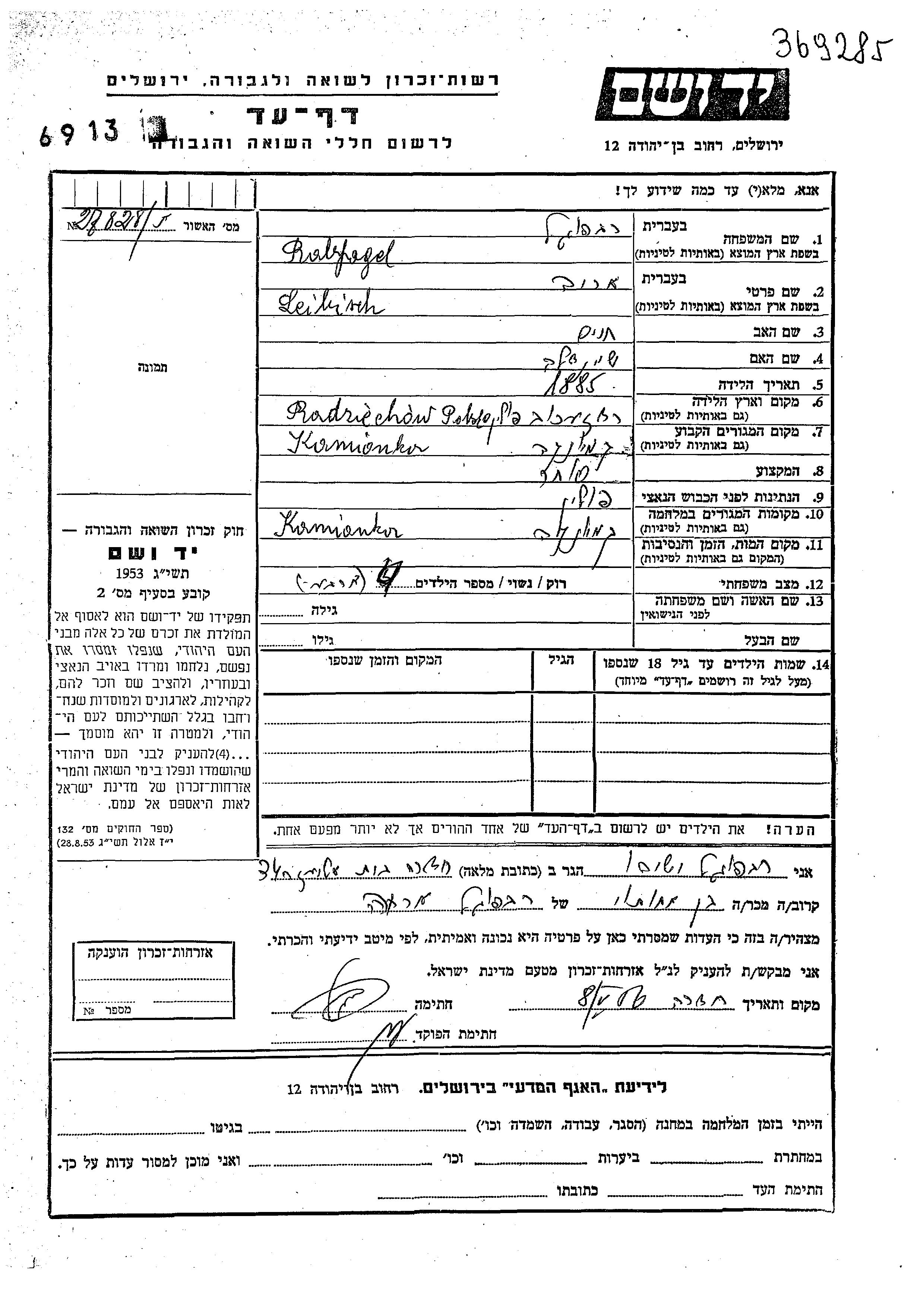 Leibisch Arie Rabfogel wurde im Jahr 1885 in Radziechow, Polen geboren. Er war der Sohn von Khaim und Sheindla. Er war Kaufmann/-frau und Verheiratet. Vor dem Zweiten Weltkrieg lebte er in Kamionka, Polen. Während des Krieges war er in Kamionka, Polen.