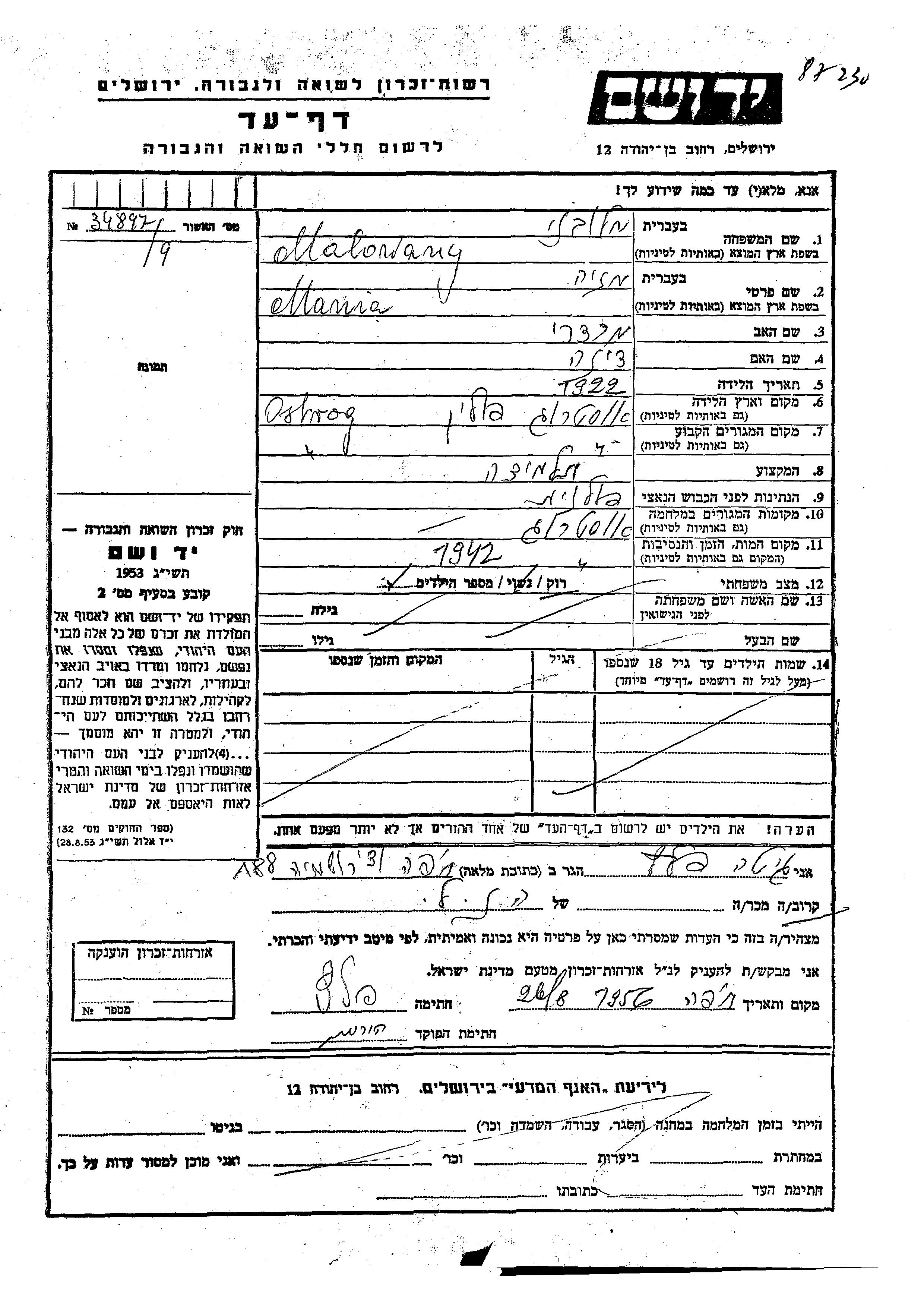 Mania Malowany wurde im Jahr 1922 in Ostrog, Polen geboren. Sie war die Tochter von Mordekhai und Dina. Sie war Schüler/-in und Ledig. Vor dem Zweiten Weltkrieg lebte sie in Ostrog, Polen. Während des Krieges war sie in Ostrog.