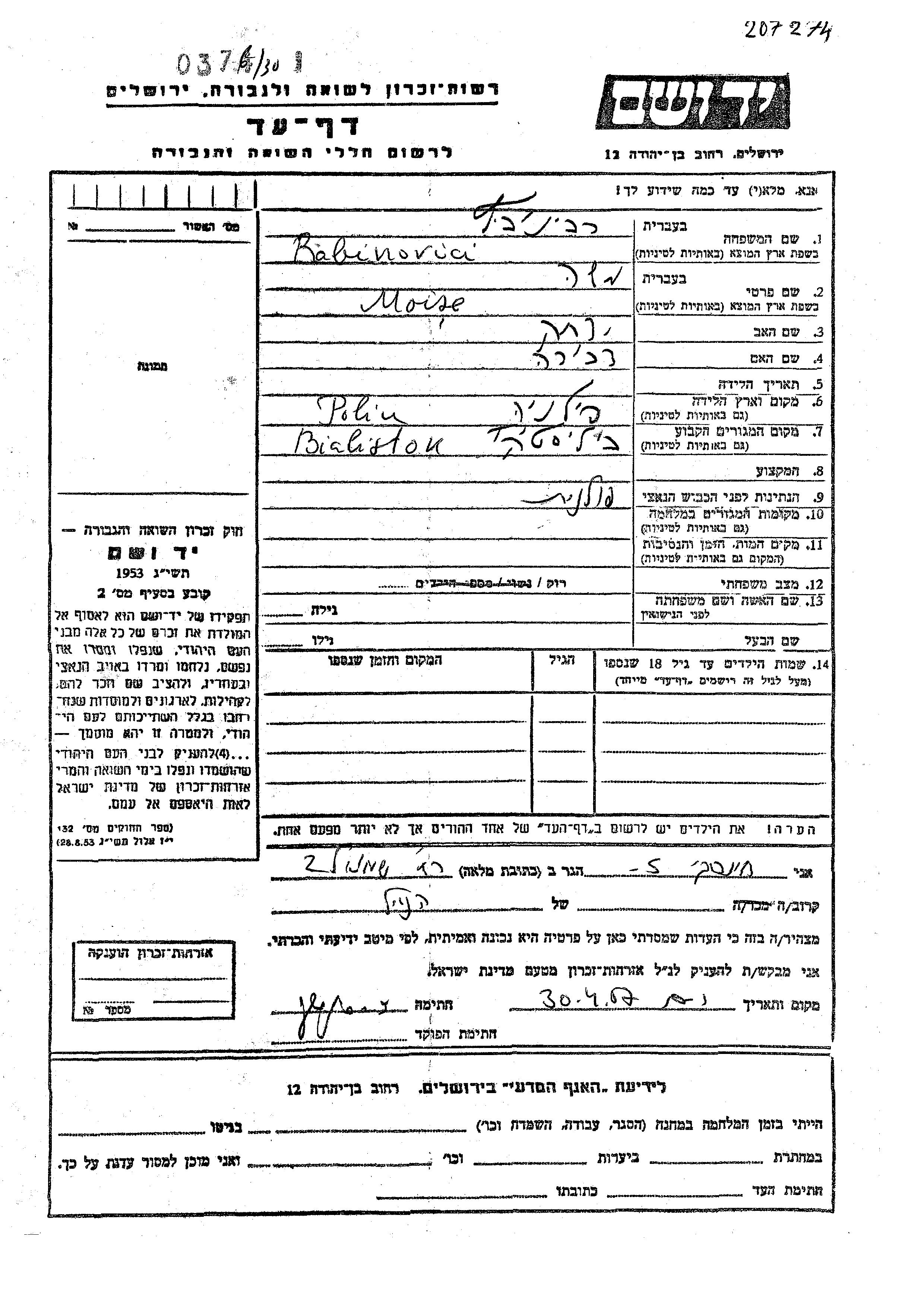Moise Rabinovici wurde in Polen geboren. Er war der Sohn von Yitzkhak und Dvora. Er war Ledig. Vor dem Zweiten Weltkrieg lebte er in Bialistok, Polen.