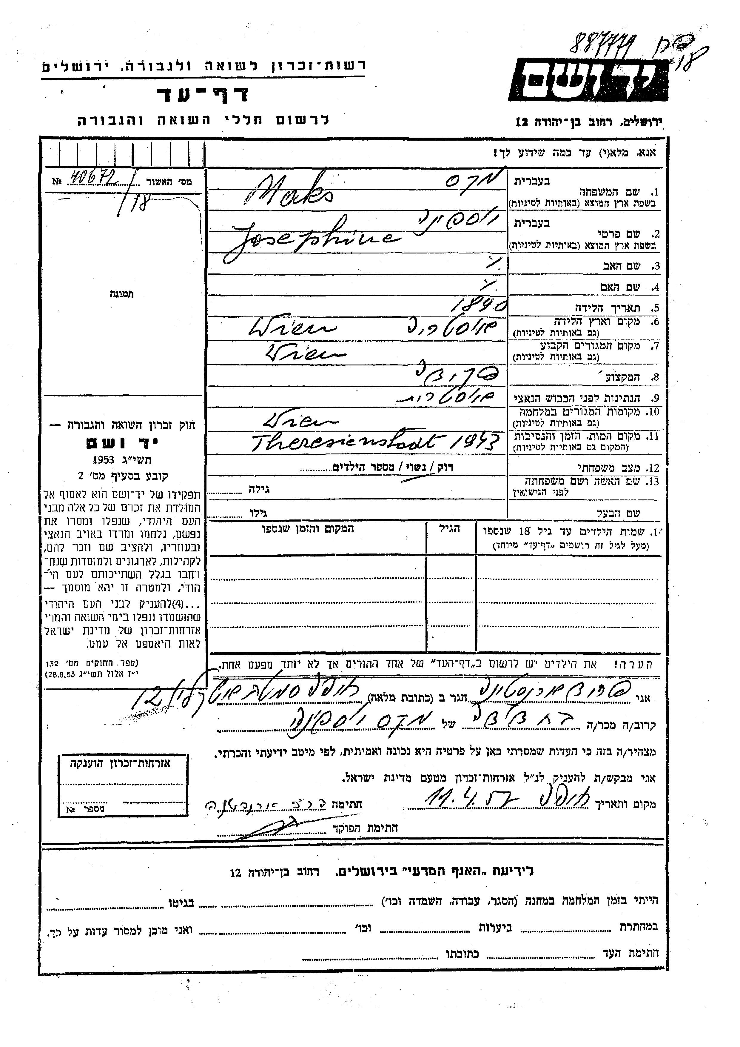 Josephina Maks wurde im Jahr 1890 in Wien, Österreich geboren. Sie war Angestellte/-r und Verheiratet. Vor dem Zweiten Weltkrieg lebte sie in Wien, Österreich. Während des Krieges war sie in Wien, Österreich.