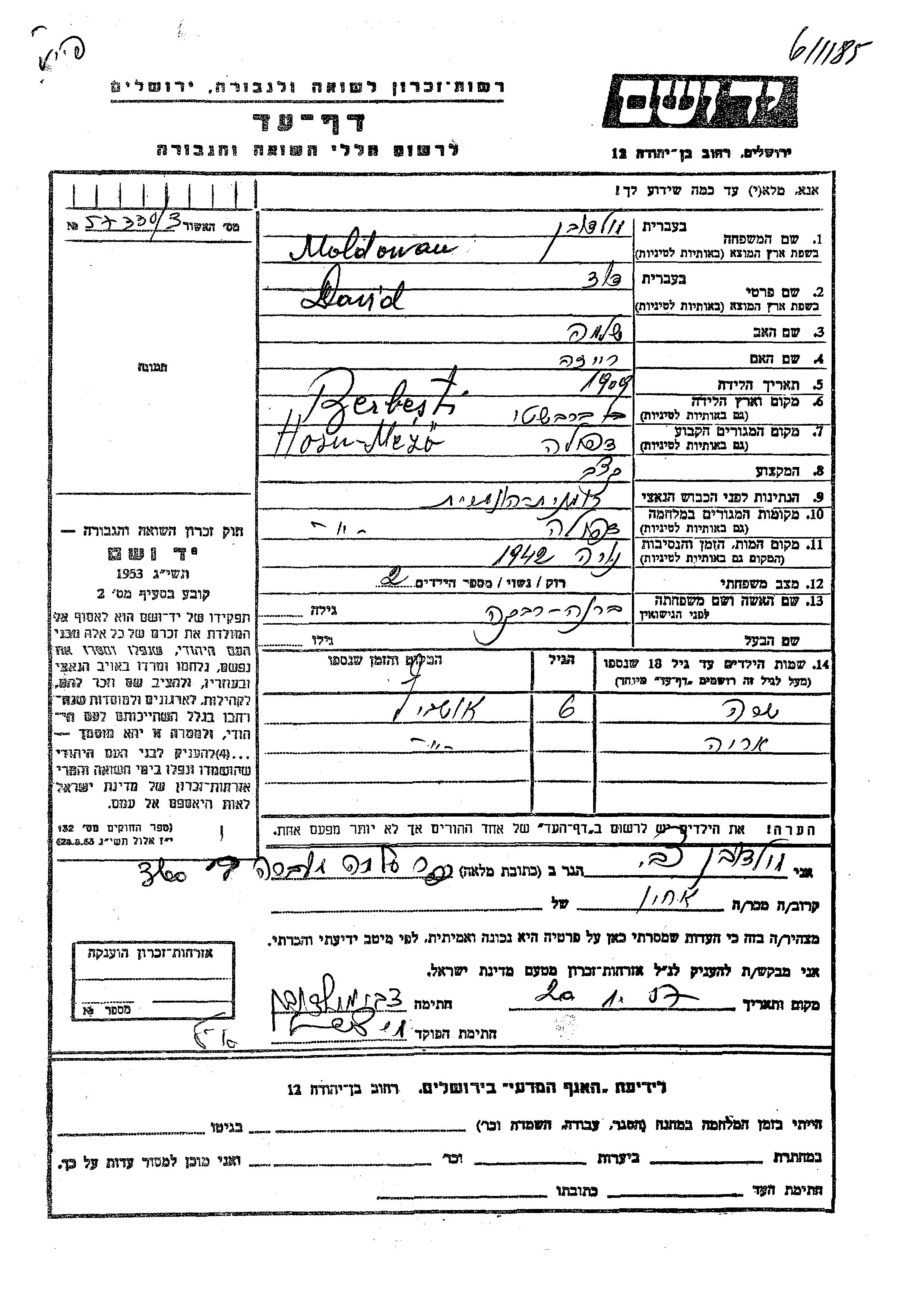 David Moldowan wurde im Jahr 1909 in Berbesti, Rumänien geboren. Er war der Sohn von Shlomo und Reiza. Er war Metzger/-in und mit Rivka Brana Verheiratet. Vor dem Zweiten Weltkrieg lebte er in Hosu Meze. Während des Krieges war er in Hosu Meze.