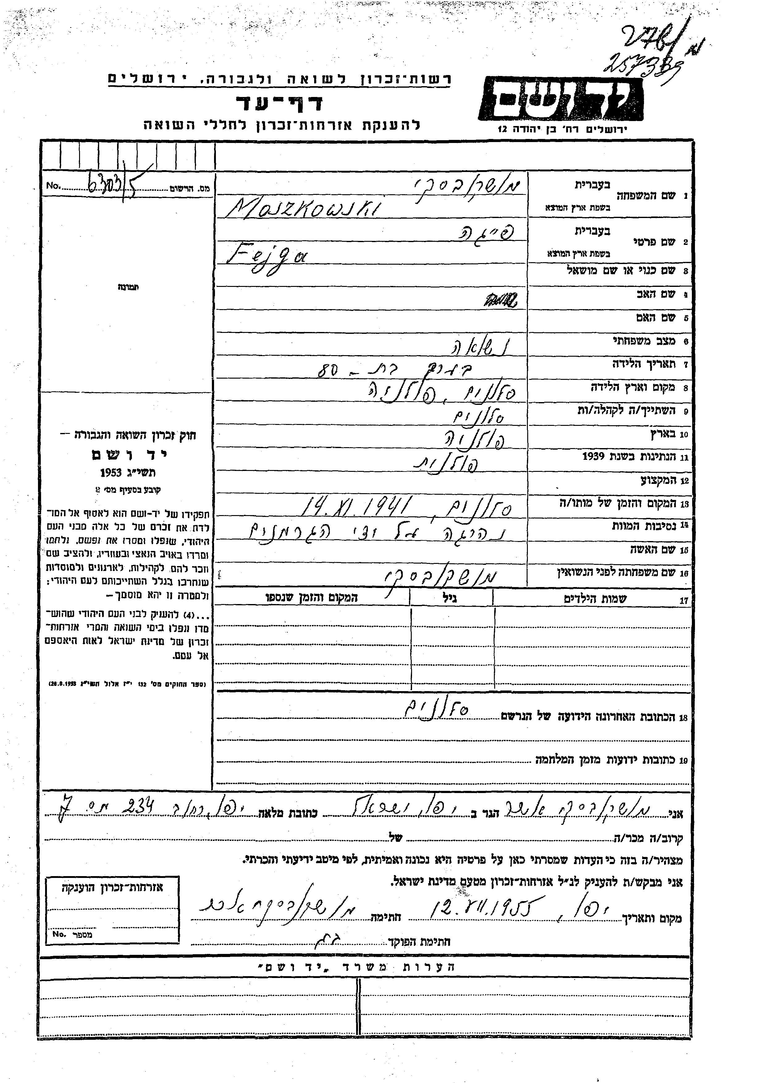 Fejga wurde in der Schoah ermordet. Todesort: Slonim, Polen im Jahr 14/11/1941.