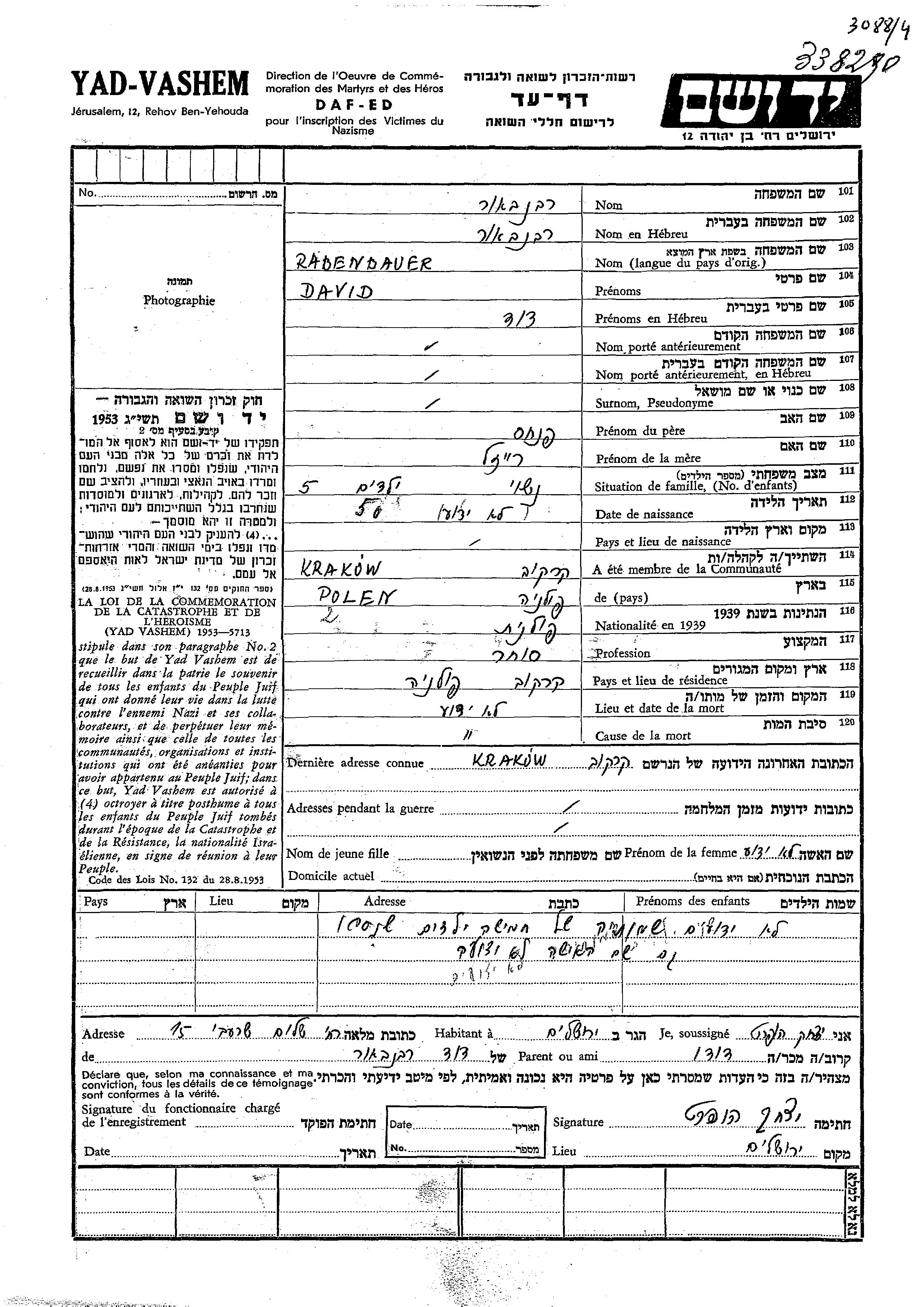 David Rabenbauer wurde Er war der Sohn von Pinkhas und Reizl. Er war Kaufmann/-frau und Verheiratet. Vor dem Zweiten Weltkrieg lebte er in Krakow, Polen.