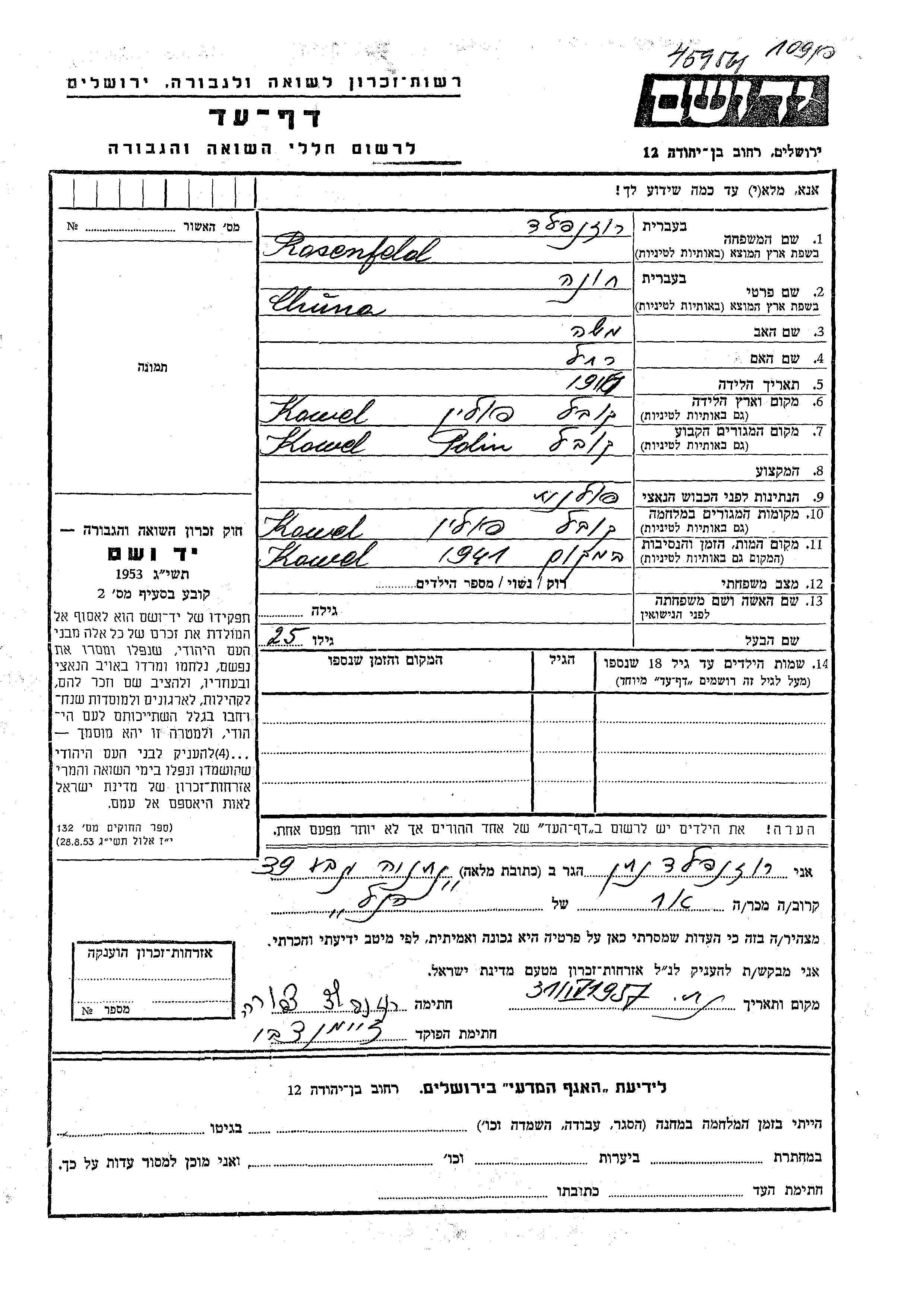Chuna Rosenfeld wurde im Jahr 1916 in Kowel, Polen geboren. Er war der Sohn von Moshe und Rakhel. Vor dem Zweiten Weltkrieg lebte er in Kowel, Polen. Während des Krieges war er in Kowel, Polen.