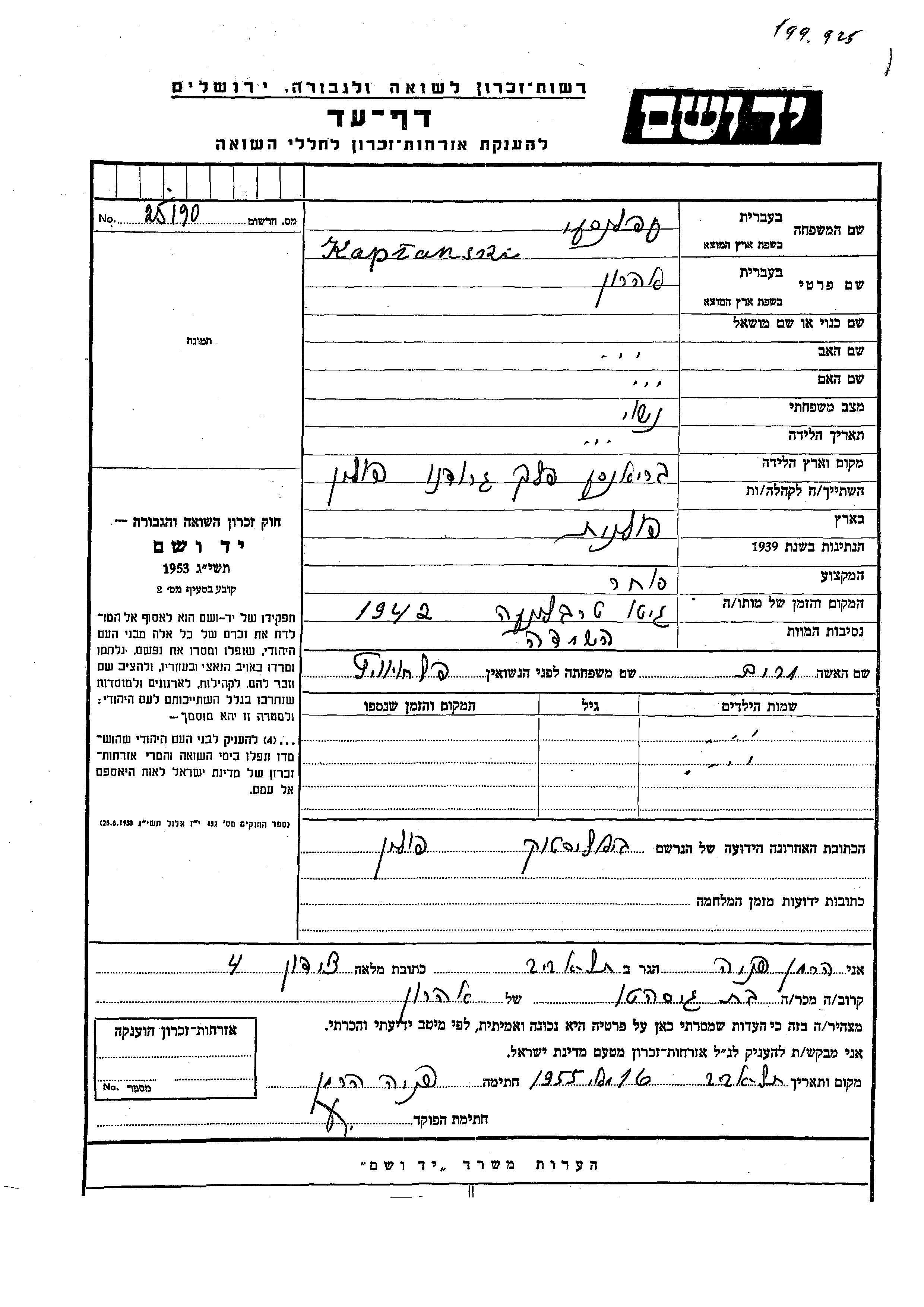 Kaplanski Aharon Bialistok, Polen Gedenkblatt