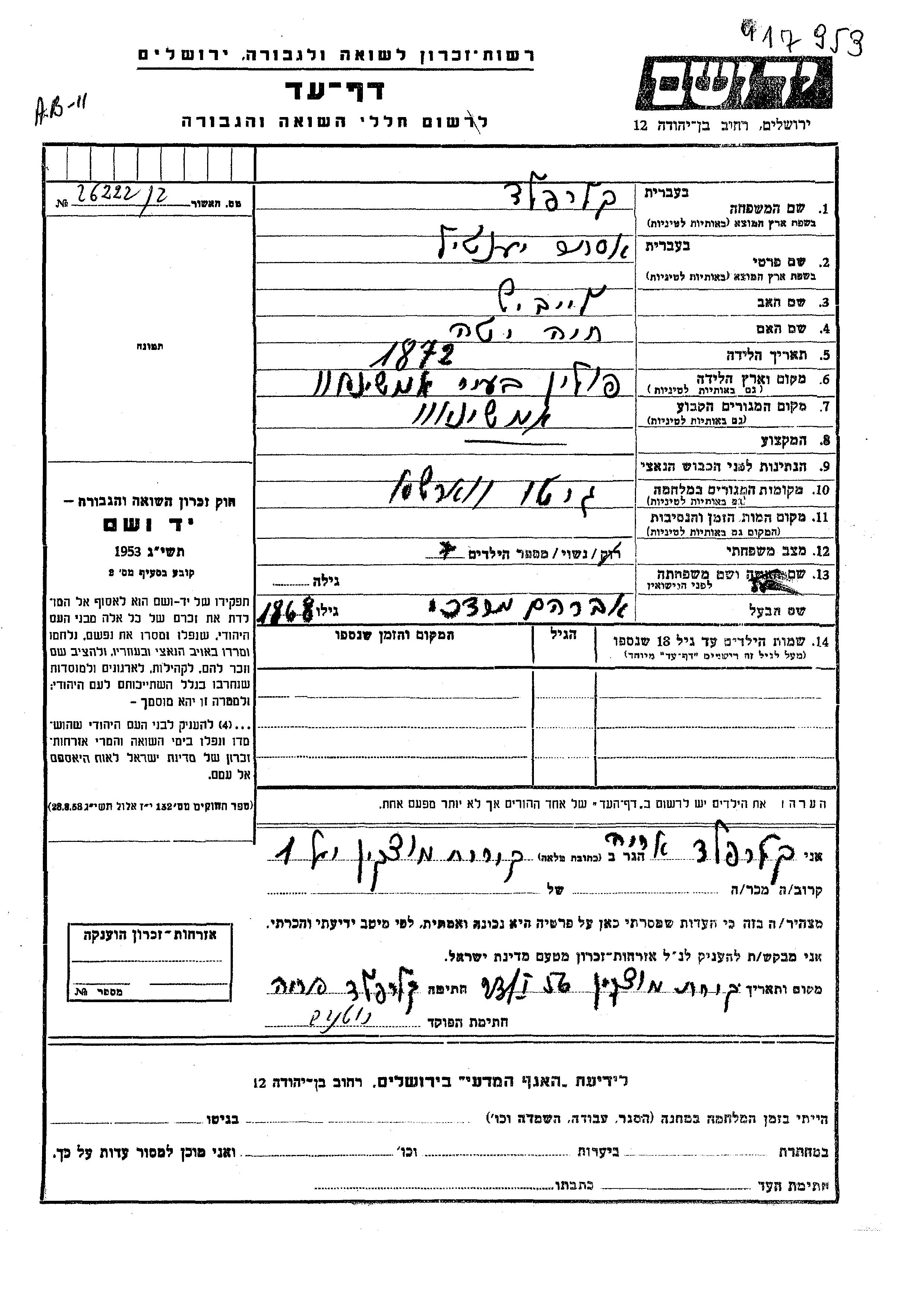 Ester Yenta Klarfeld wurde im Jahr 1872 in Amshinov, Polen geboren. Sie war die Tochter von Leibish und Khaia Yeta. Sie war mit Avraham Mordekhai Verheiratet. Vor dem Zweiten Weltkrieg lebte sie in Amshinov, Polen. Während des Krieges war sie in Warszawa, Polen.