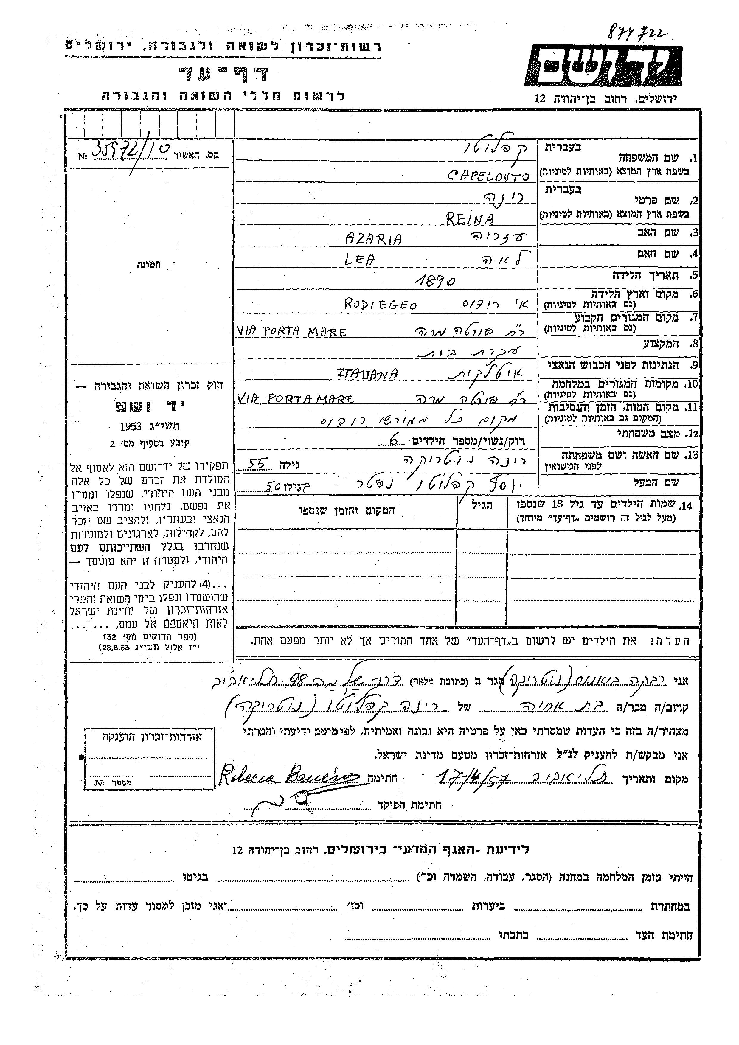 Reina Rina Capelouto, geb. Notrika wurde im Jahr 1890 in Rodi, Italien geboren. Sie war die Tochter von Azaria und Lea. Sie war Hausfrau und mit Yosef Witwe. Vor dem Zweiten Weltkrieg lebte sie in Rodi, Italien. Während des Krieges war sie in Rodi, Italien.