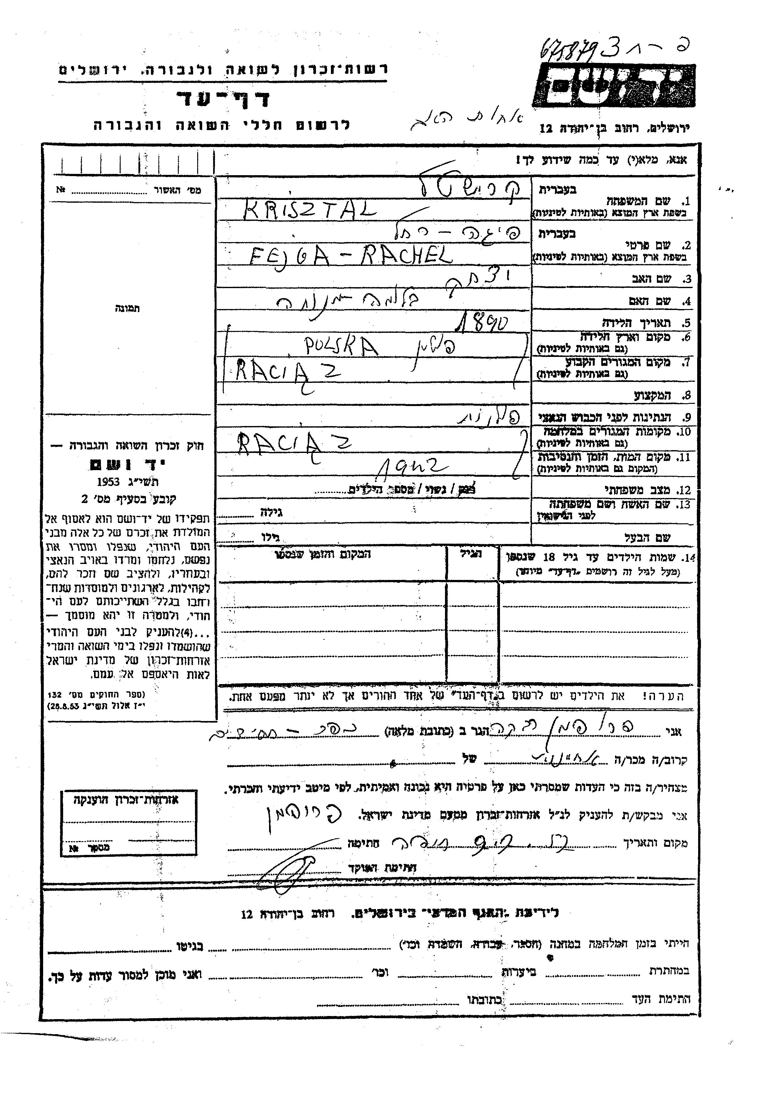 Krisztal Fejga Rachel 1890 Raciaz, Polen Gedenkblatt