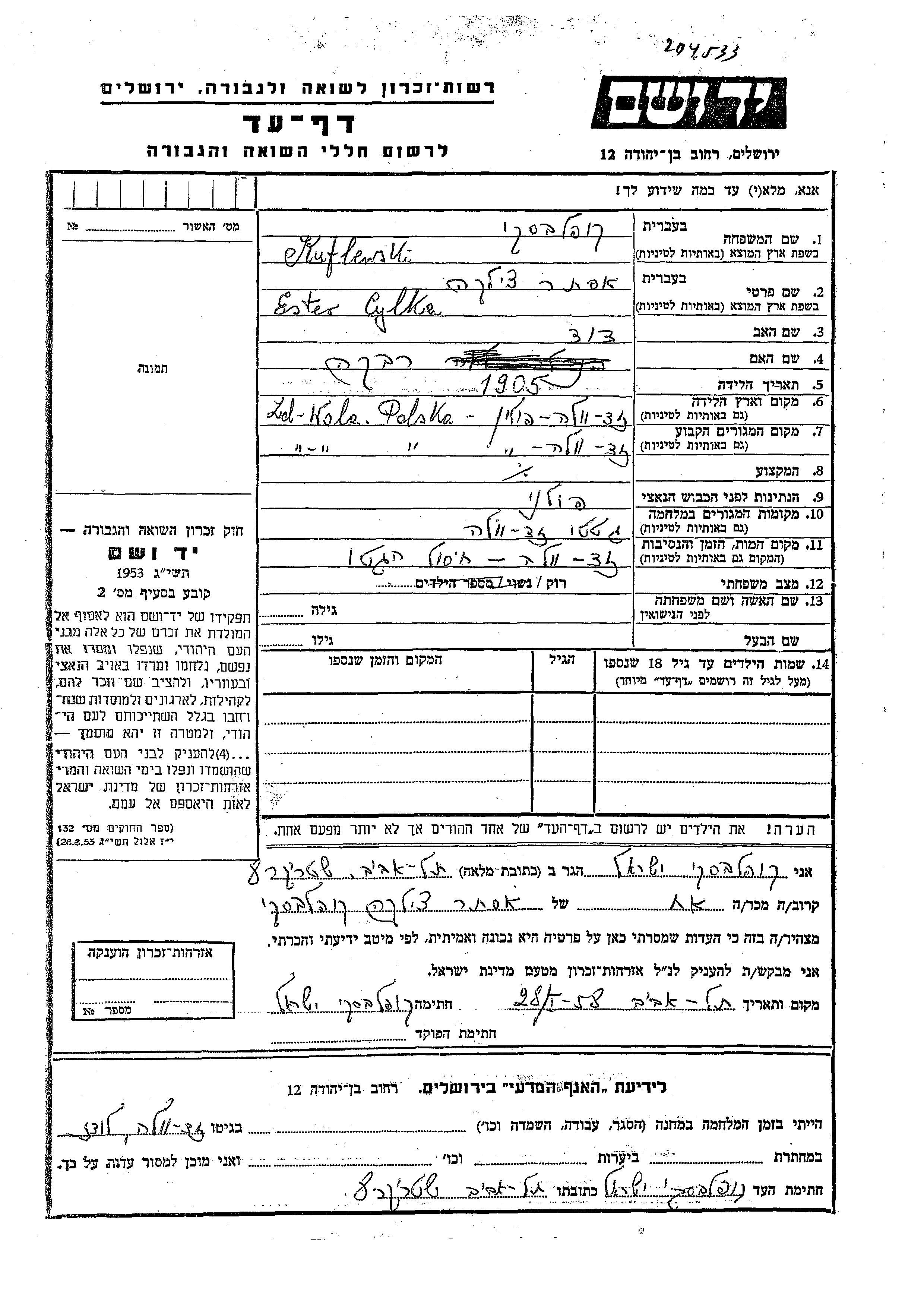 Cylka Ester Kuflewski wurde im Jahr 1905 in Zdunska Wola, Polen geboren. Sie war die Tochter von David und Rivka. Sie war Ledig. Vor dem Zweiten Weltkrieg lebte sie in Zdunska Wola, Polen. Während des Krieges war sie in Zdunska Wola, Polen.