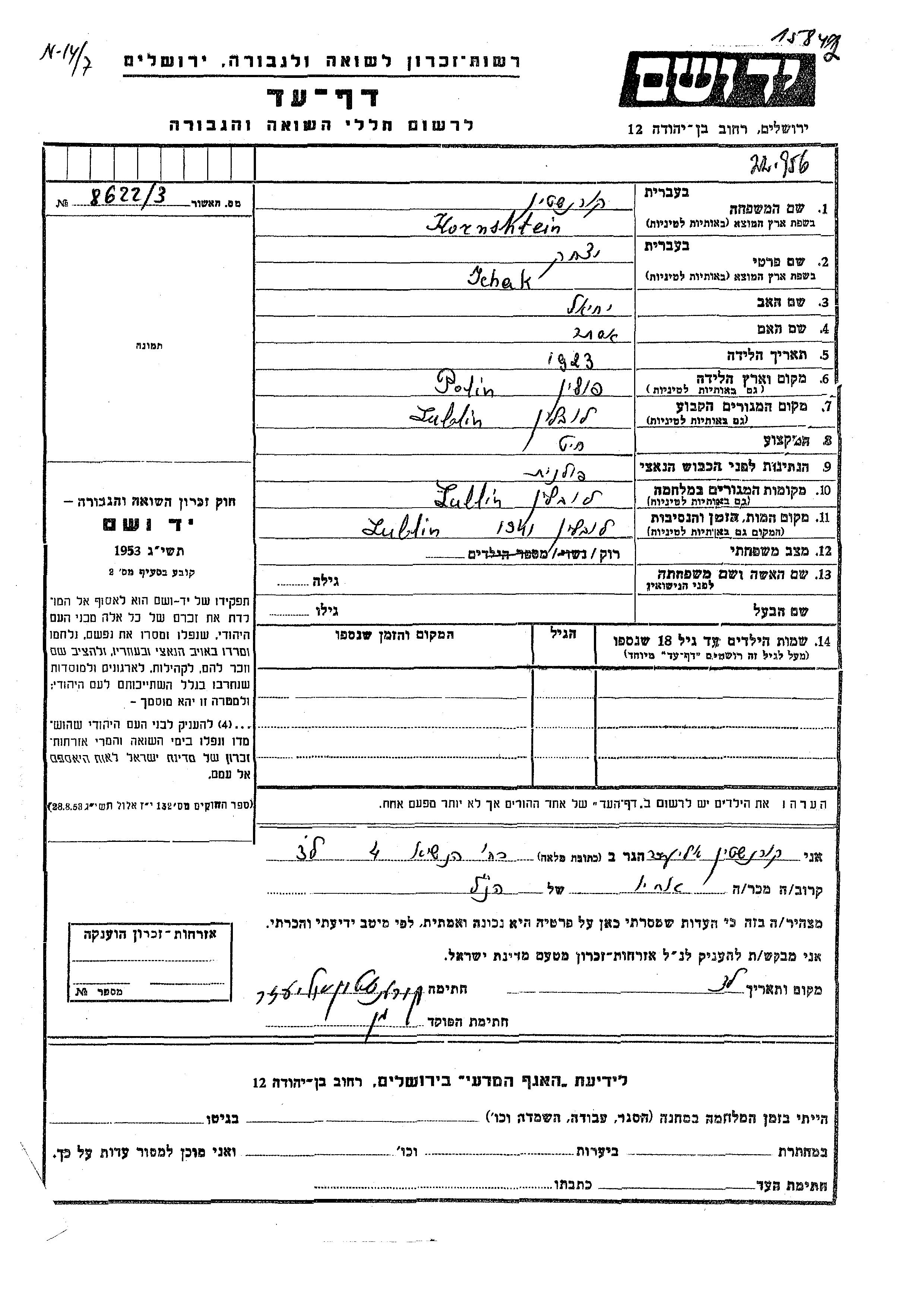 Kornshtein Jchak 1923 Lublin, Polen Gedenkblatt